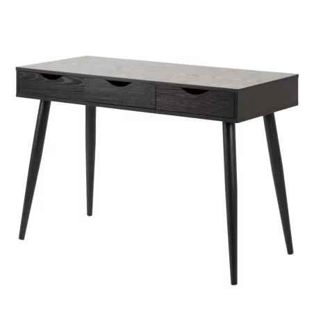 Nikos to biurko w kolorze czarnym, które wyróżnia się starannym projektem. Prostokątny blat mebla o długości 110 cm zapewnia wygodną przestrzeń do pracy, a cztery nogi ustawione pod kątem dodają meblowi charakteru. Trzy pojemne szuflady zapewniają wystarczającą ilość miejsca na niezbędne akcesoria.