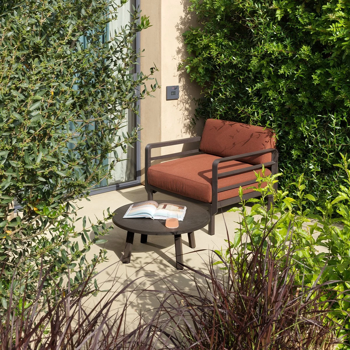 Konstrukcja stolika wykonana została z regenerowanej żywicy polipropylenowej wzmacnianej włóknem szklanym. Materiał barwiony w masie jest odporny na promieniowanie UV i zmienne warunki atmosferyczne. Matowe wykończenie nadaje mu eleganckiego charakteru, a antypoślizgowe stopki zapewniają stabilność użytkowania. Stolik Nardi Maximo 70 Mini w całości nadaje się do recyklingu – to ekologiczny wybór na lata.