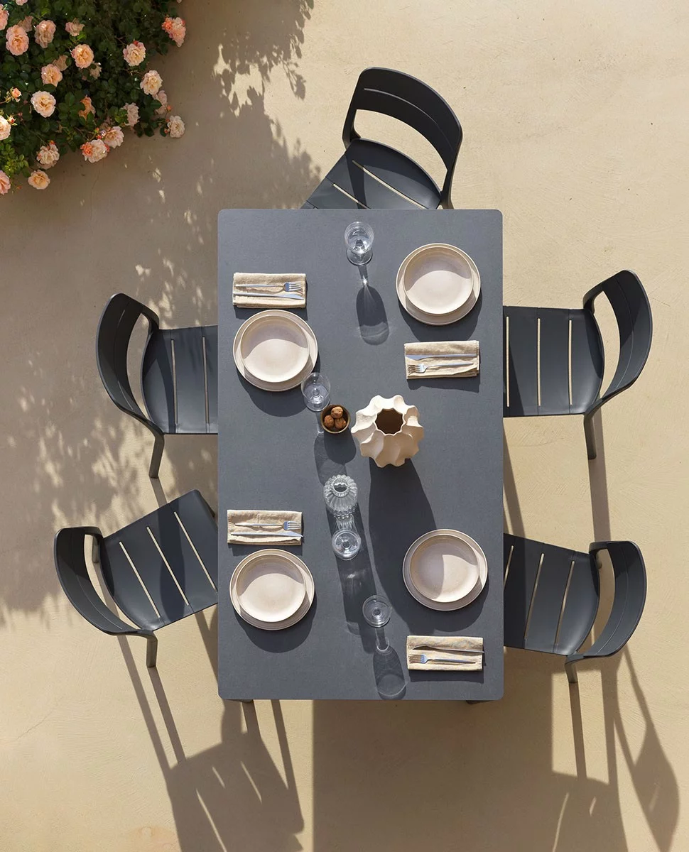 Stół Nardi Piave 160x90 posiada regulowane stopki, które umożliwiają dopasowanie wysokości do nierównych powierzchni. Matowe wykończenie blatu i nóg podkreśla nowoczesny charakter stołu, a wysokiej jakości materiały zapewniają odporność na codzienne użytkowanie w ogrodzie, na tarasie czy w przestrzeniach komercyjnych.