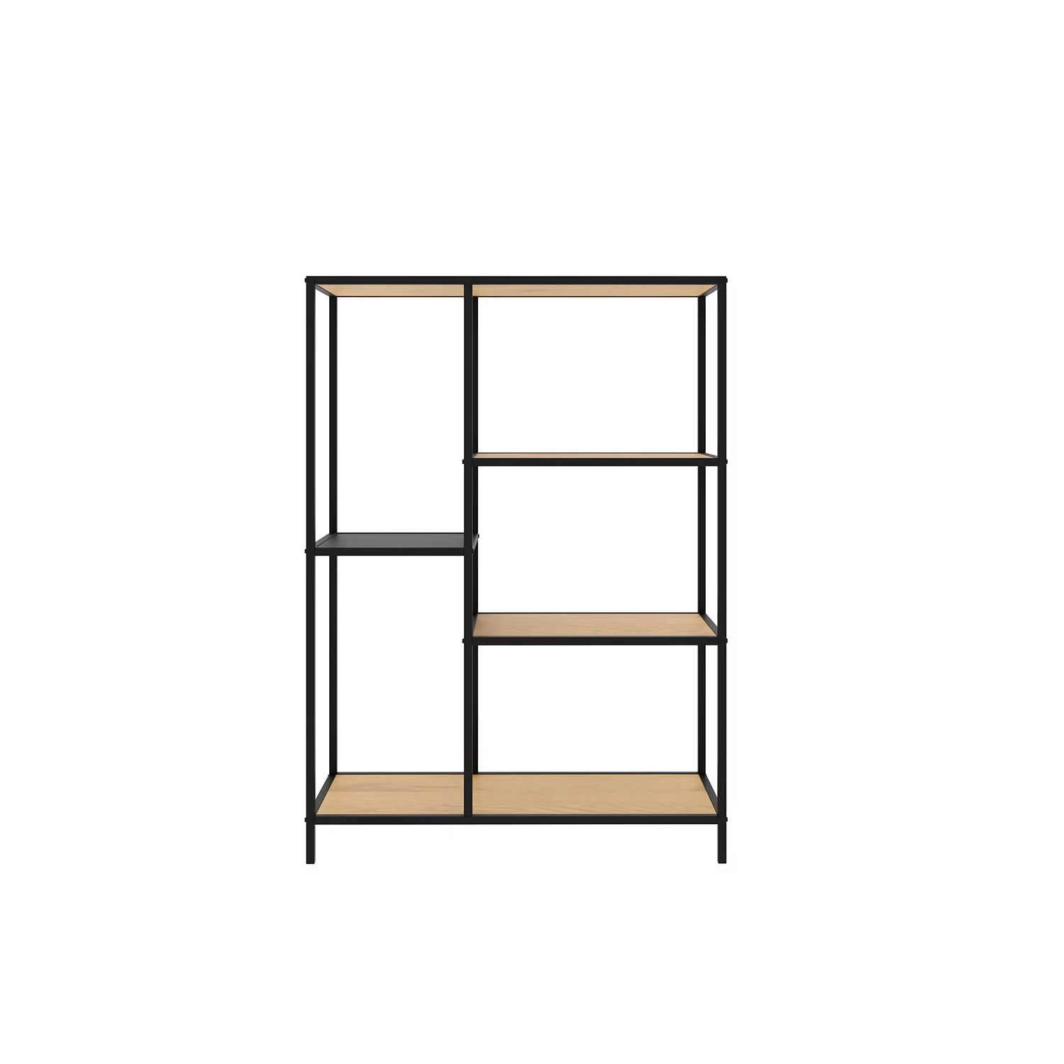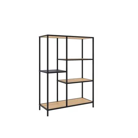 Korpus regału wykonano z trwałej płyty laminowanej w dekorze drewna, natomiast solidny stelaż z metalu malowanego na czarno gwarantuje stabilność i długowieczność mebla. Cztery przestronne półki zapewniają dużo miejsca na książki, dekoracje lub inne przedmioty, pozwalając utrzymać porządek w pomieszczeniu.