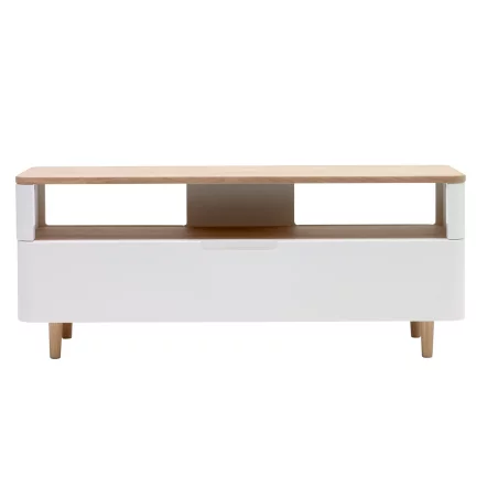 Szafka RTV AMALFI 120 to elegancki mebel w stylu modern, który łączy białe wykończenie z naturalnymi akcentami drewna dębowego. Dzięki minimalistycznej formie i funkcjonalnym półkom stanowi doskonałe rozwiązanie do salonu, zapewniając wygodne miejsce na sprzęt RTV oraz dekoracje.