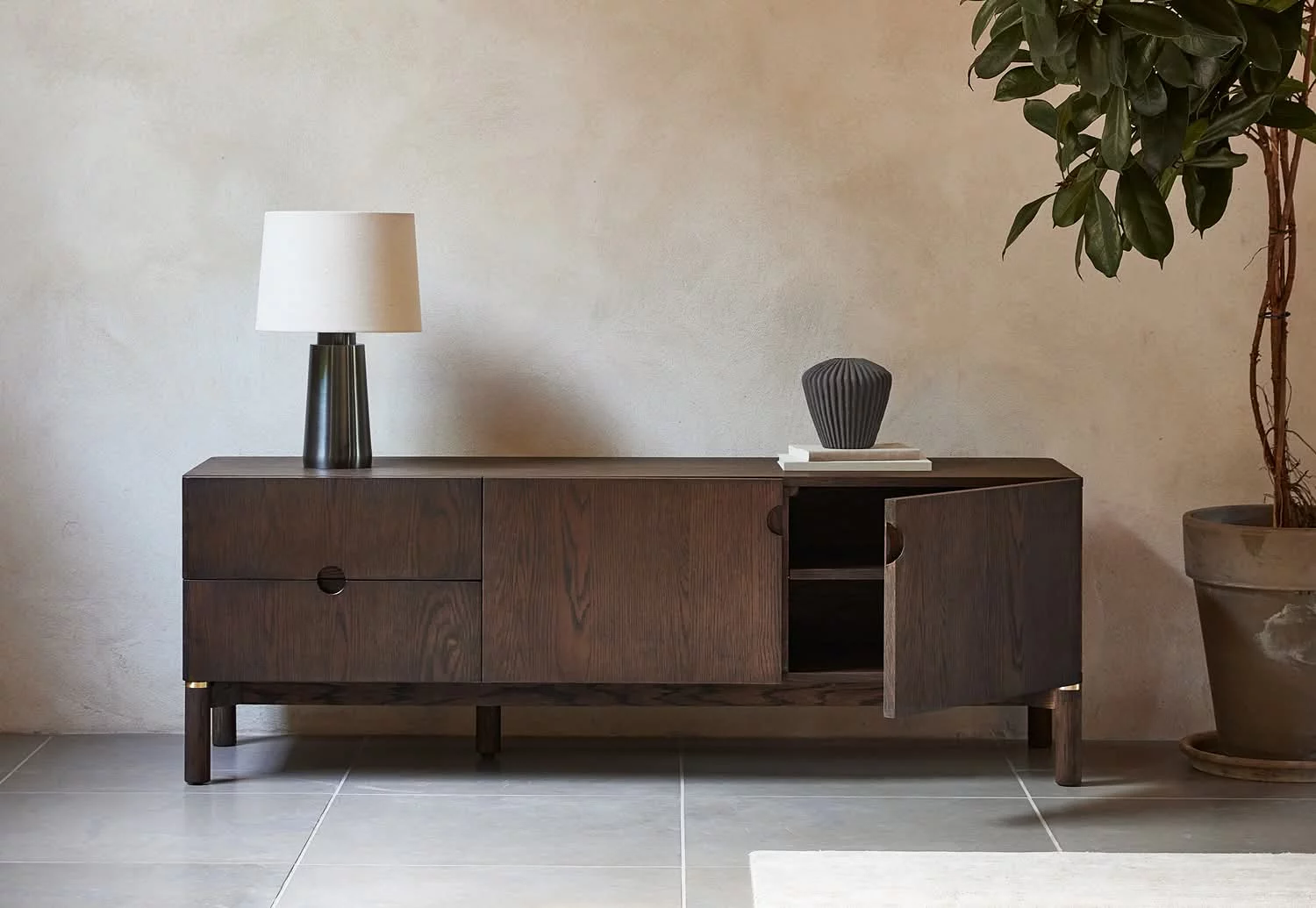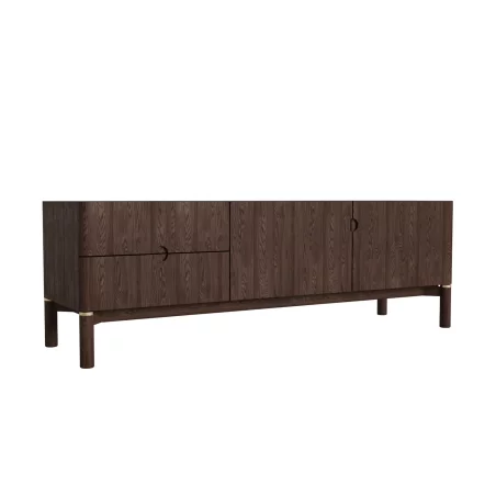 Szafka RTV ARUN 160 w kolorze dąb dymiony to elegancki mebel, który doskonale sprawdzi się w salonie. Jej minimalistyczny design w połączeniu z ciepłym, ciemnym odcieniem drewna wprowadza przytulny i nowoczesny charakter do wnętrza, zapewniając jednocześnie praktyczne miejsce na sprzęt RTV i dekoracje.
