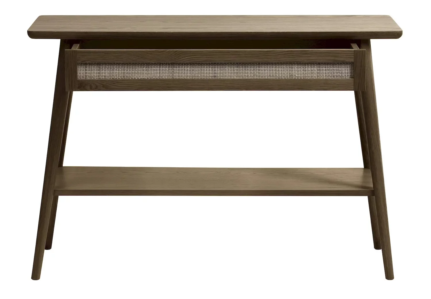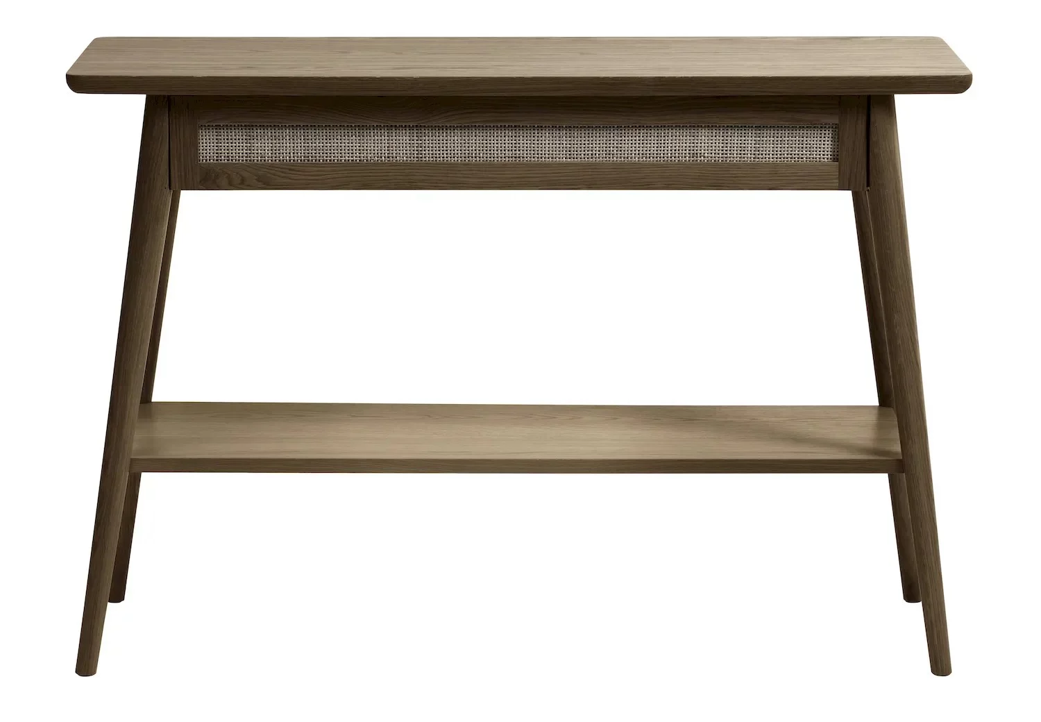 Konsola BARRALI 110 to elegancki i funkcjonalny mebel, idealny do sypialni lub pokoju młodzieżowego. Blat z płyty fornirowej w kolorze dębu naturalnego oraz solidne drewniane nóżki zapewniają trwałość i stabilność, a rattanowa półka dodaje meblowi lekkości i naturalnego charakteru.