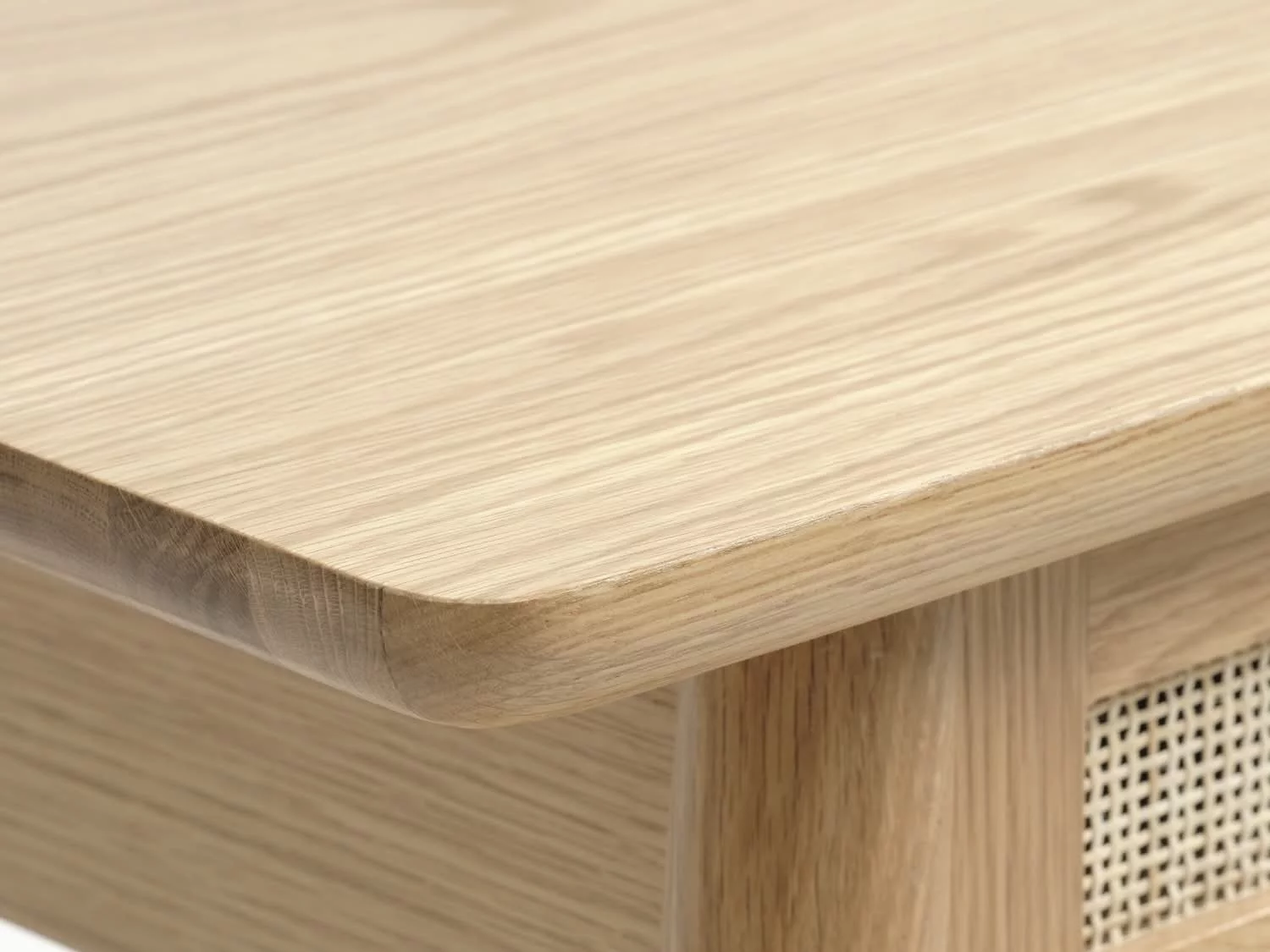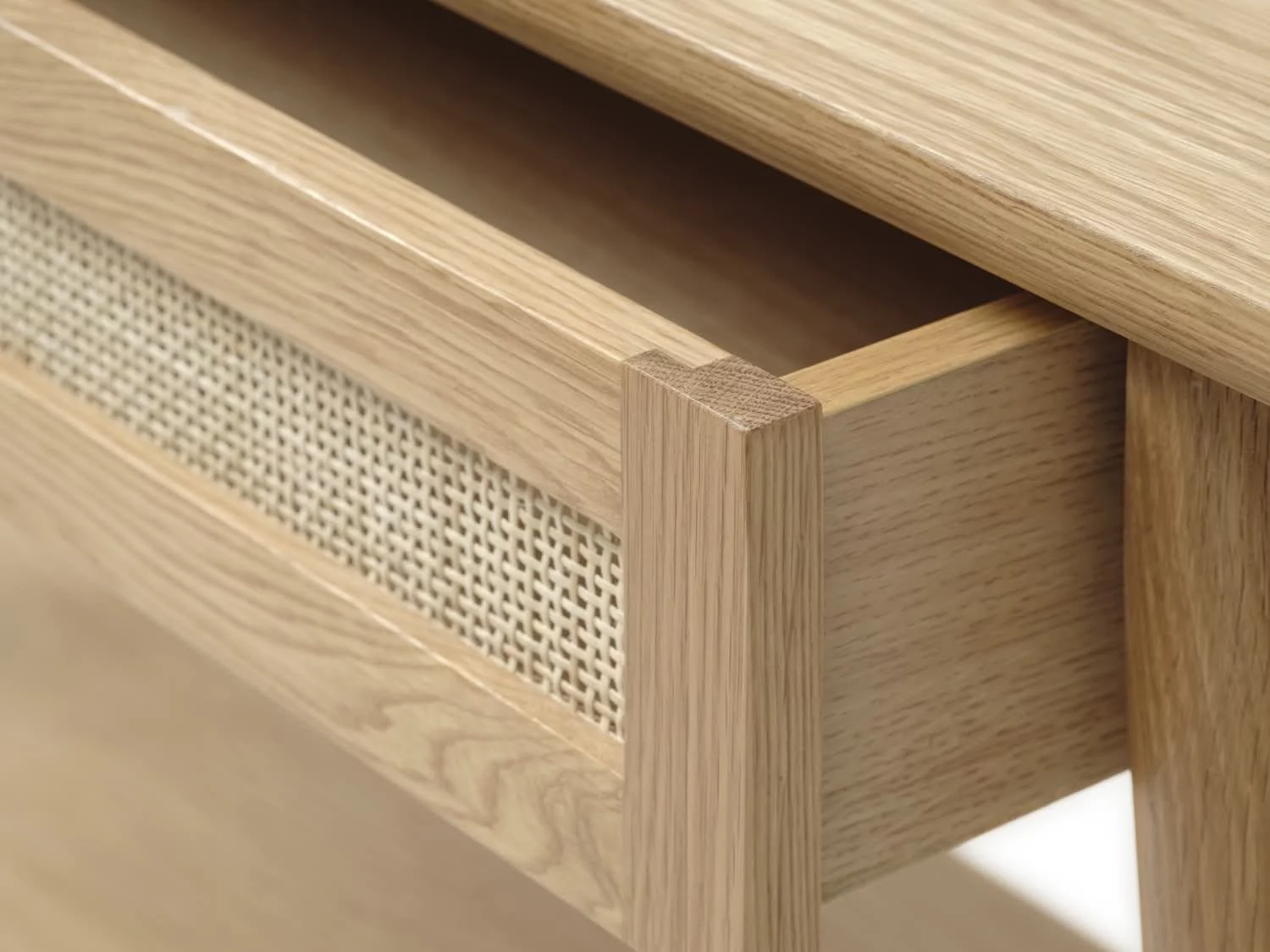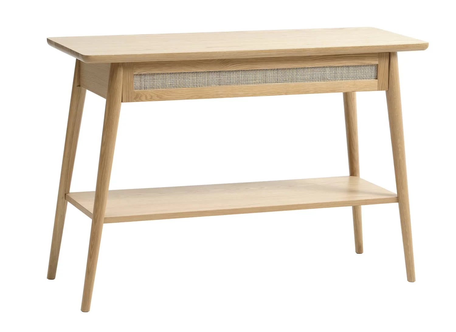 Konsola BARRALI 110 to elegancki i funkcjonalny mebel, idealny do sypialni lub pokoju młodzieżowego. Blat z płyty fornirowej w kolorze dębu naturalnego oraz solidne drewniane nóżki zapewniają trwałość i stabilność, a rattanowa półka dodaje meblowi lekkości i naturalnego charakteru.