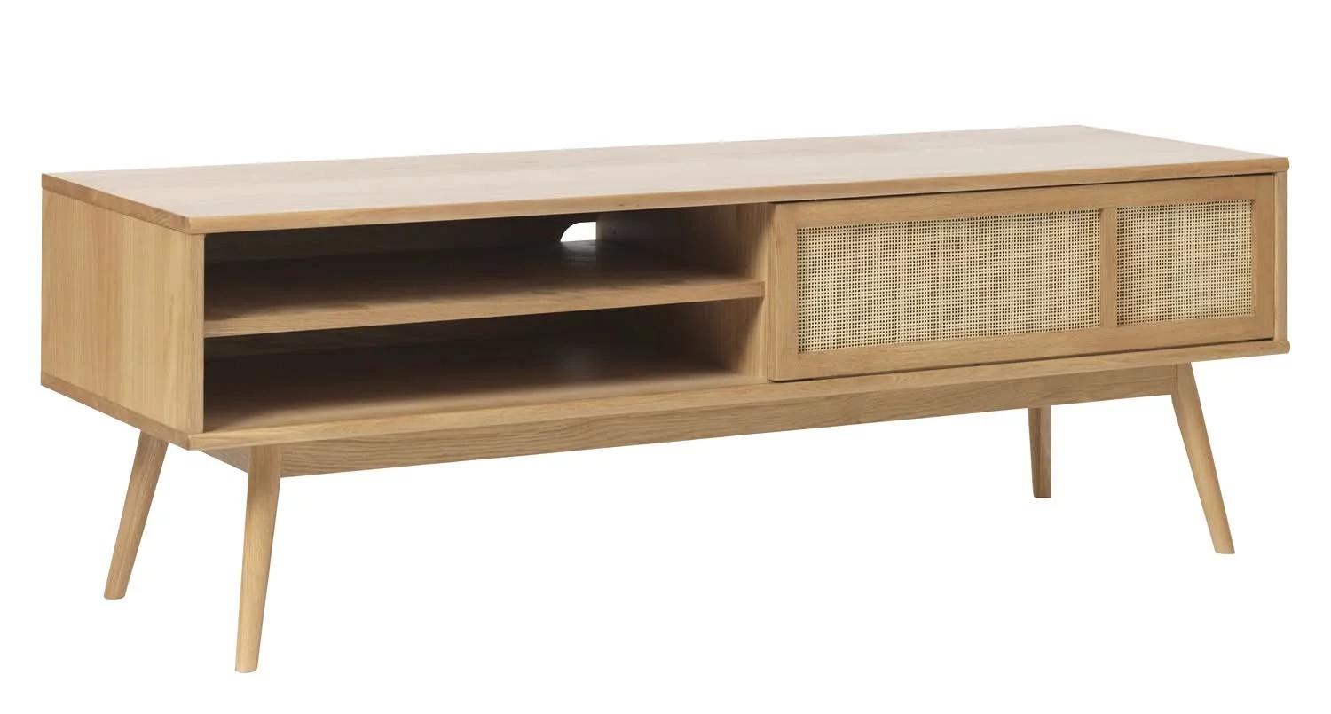 Szafka posiada przesuwne drzwi oraz praktyczną półkę, idealną do przechowywania sprzętu multimedialnego, książek lub dekoracji. Rattanowy front dodaje lekkości i wyjątkowego charakteru, dzięki czemu mebel świetnie prezentuje się zarówno w nowoczesnych, jak i klasycznych aranżacjach.