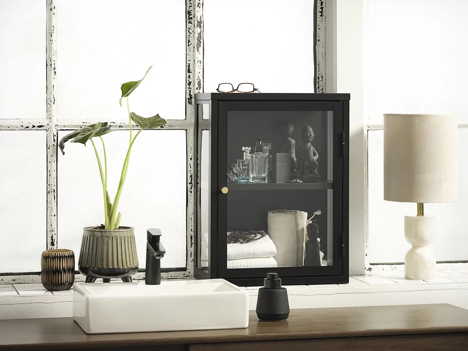 Czarny kolor witryny wprowadza industrialny charakter i elegancję, dzięki czemu mebel doskonale komponuje się z aranżacjami w stylu Loft oraz nowoczesnymi wnętrzami, dodając przestrzeni wyrazistości i nowoczesnego wyglądu.