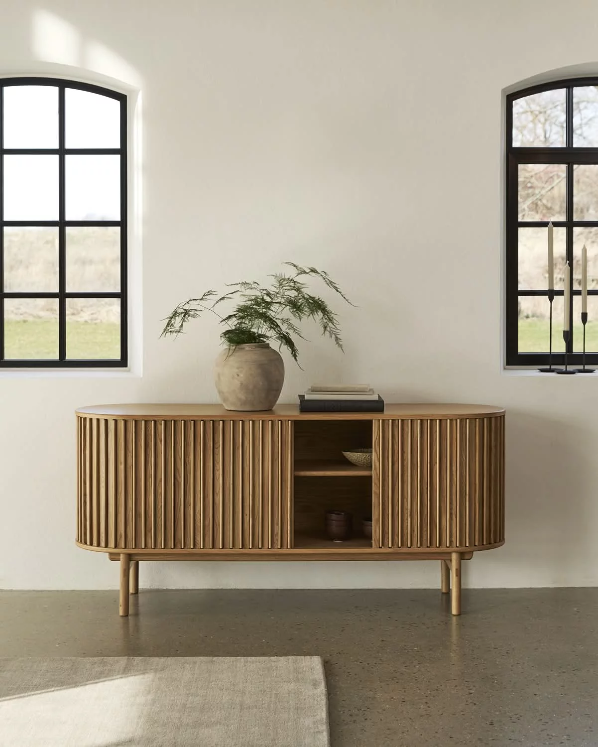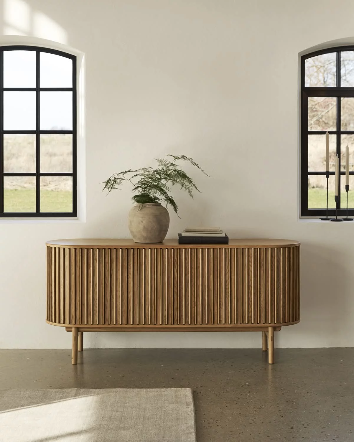 Komoda CARNO 160 to stylowy mebel, który łączy funkcję dekoracyjną z praktycznym przechowywaniem. Wykonana z płyty wiórowej pokrytej fornirem dębowym oraz z litego drewna dębowego, oferuje trwałość, stabilność i naturalny wygląd. Matowe wykończenie w odcieniu dębu naturalnego, szczebelkowe fronty oraz wbudowane uchwyty podkreślają rękodzielniczy charakter mebla i nordycki styl.