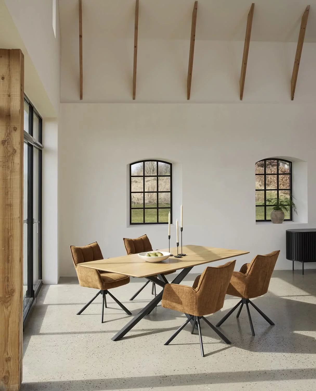 CESURA doskonale sprawdzi się zarówno w przestronnej jadalni, jak i w nowoczesnym salonie. Naturalny odcień blatu świetnie komponuje się z czernią i surowymi dodatkami, tworząc spójną, loftową aranżację.