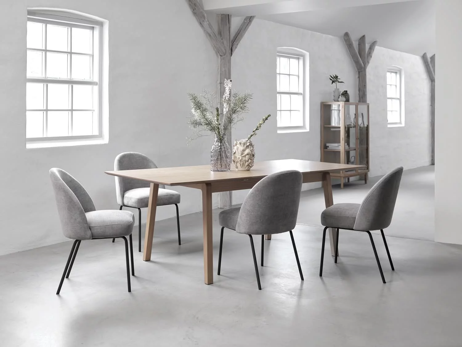 Krzesło CRESTON to elegancki i funkcjonalny mebel, który doskonale sprawdzi się w jadalni i salonie. Tapicerowane siedzisko wykonane z wysokiej jakości tkaniny zapewnia wygodę, a minimalistyczny design w połączeniu z prostymi, czarnymi metalowymi nogami nadaje krzesłu nowoczesny charakter w stylu Scandi i Modern.