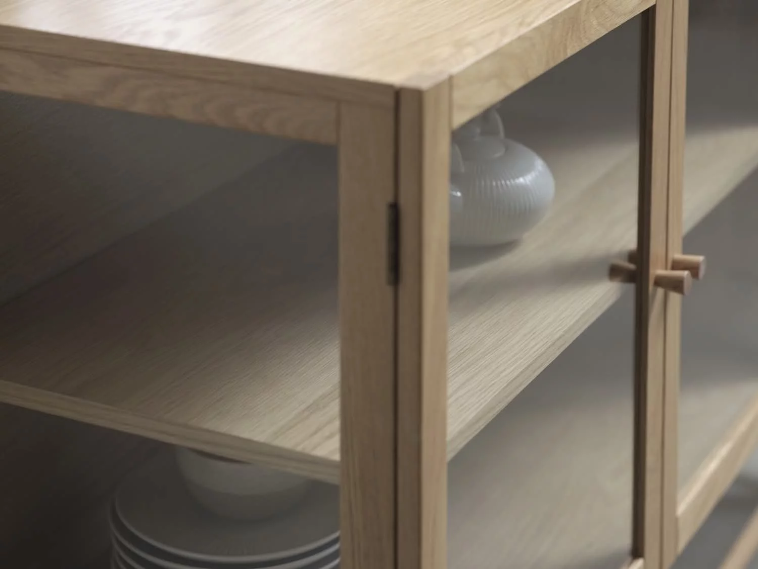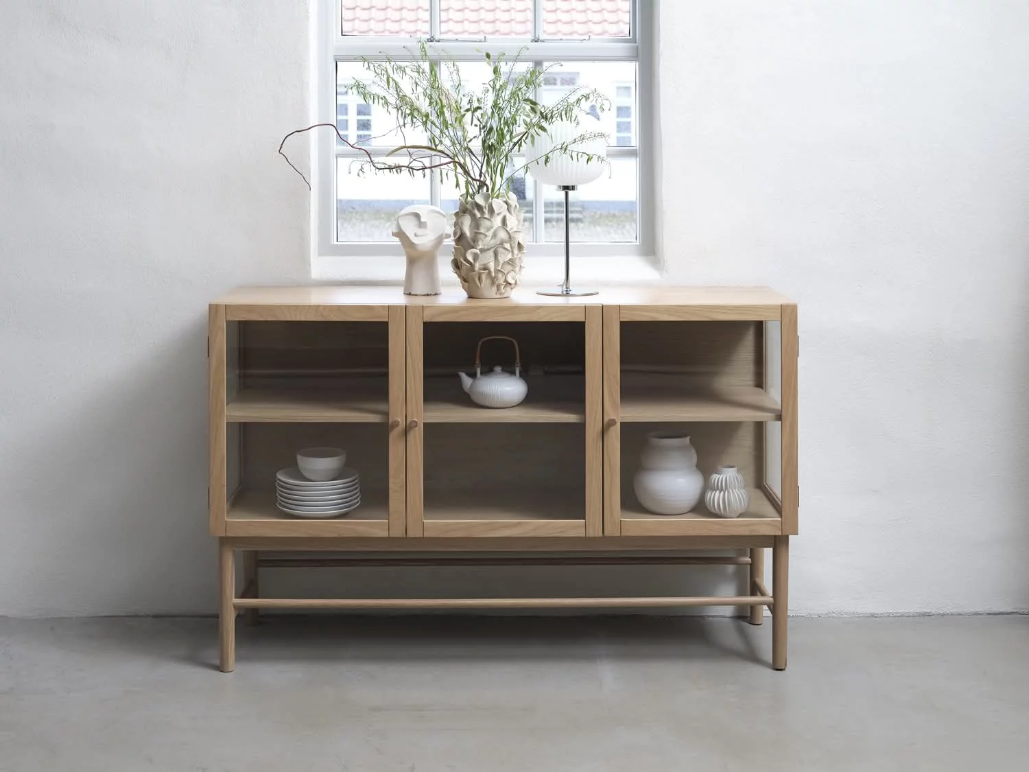 Trzy uchylne drzwi, w tym jedno z przeszkleniem, pozwalają wyeksponować dekoracje lub zastawę, a dwie półki oferują przestrzeń do przechowywania. Minimalistyczny design komody ELBA 140 sprawia, że doskonale komponuje się z wnętrzami w stylu Scandi i Boho, łącząc praktyczność z elegancją.