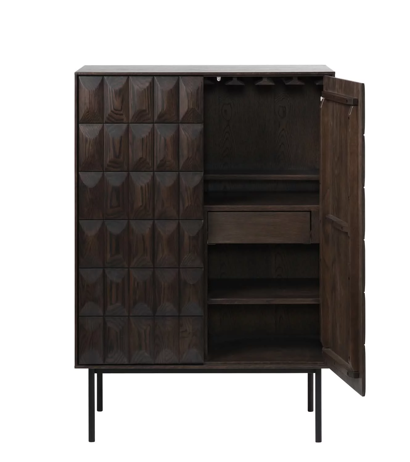Komoda LATINA to stylowy mebel łączący funkcję komody i barku, idealny do salonu lub jadalni. Wyposażona w 2 drzwi typu push-to-open, 3 półki oraz praktyczną szufladę, umożliwia wygodne przechowywanie naczyń, akcesoriów barowych i innych drobiazgów, utrzymując przestrzeń w porządku.