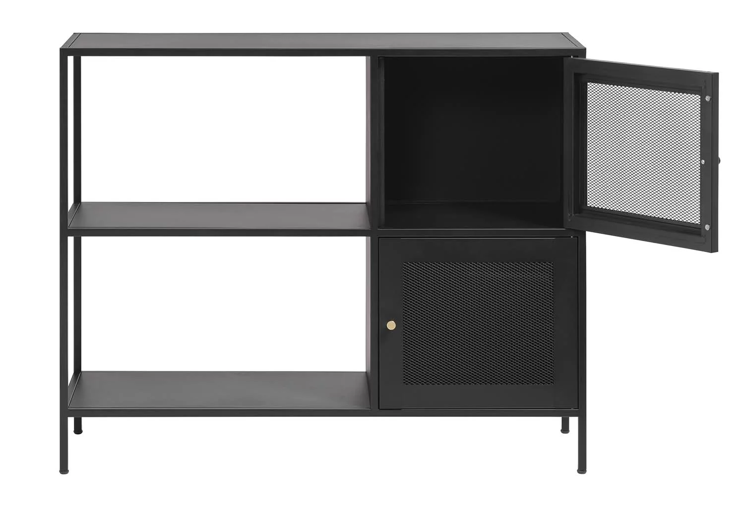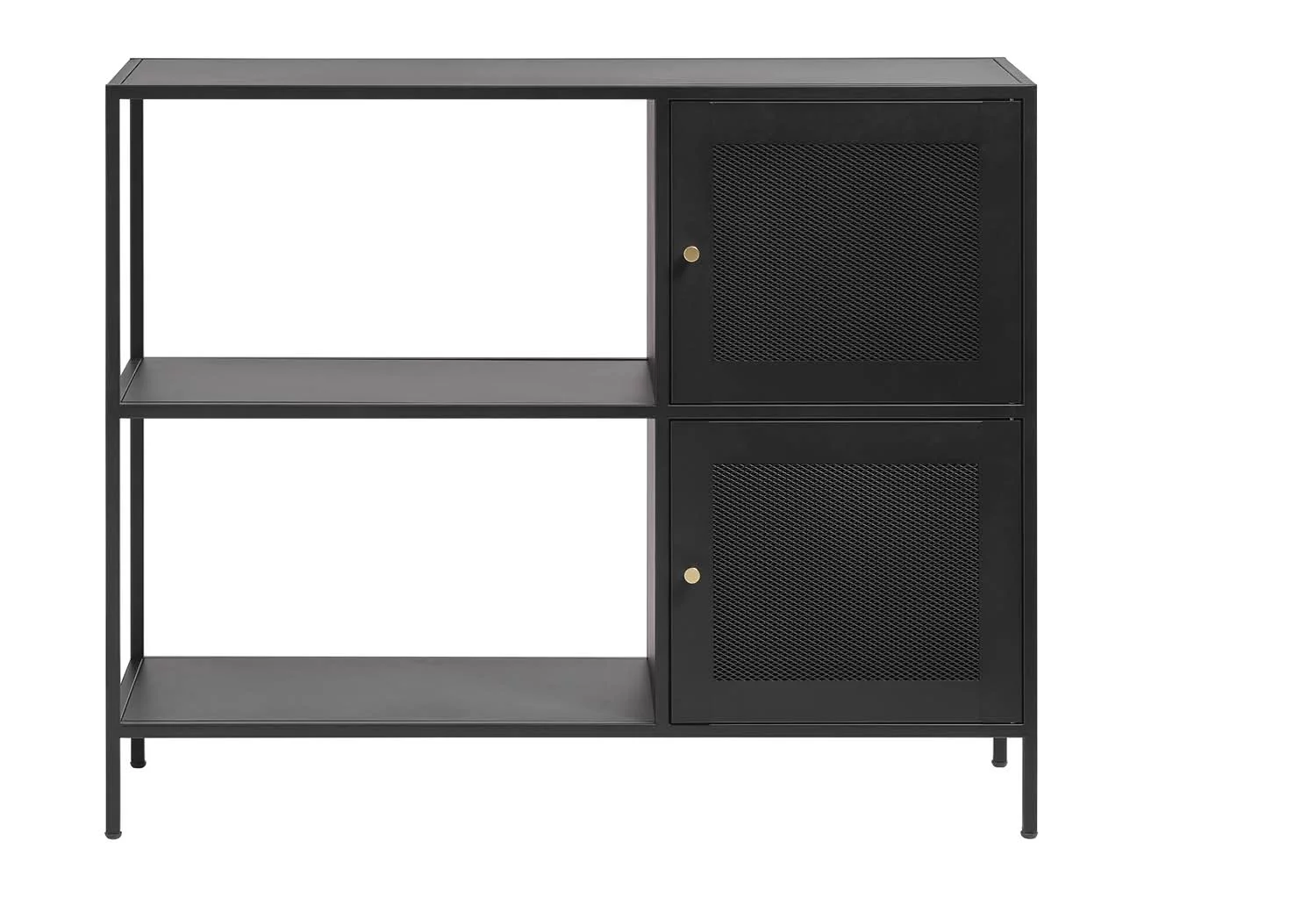 Regał MALIBU 100 to stylowy mebel, który łączy funkcjonalność z minimalistycznym designem. Wykonany w całości z metalu w matowej czerni z subtelnym, złotym uchwytem, wprowadza do wnętrza industrialny, loftowy charakter.
