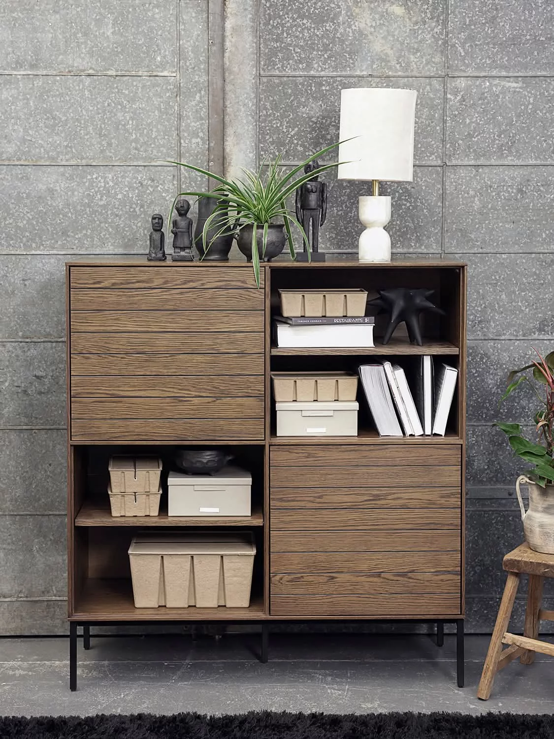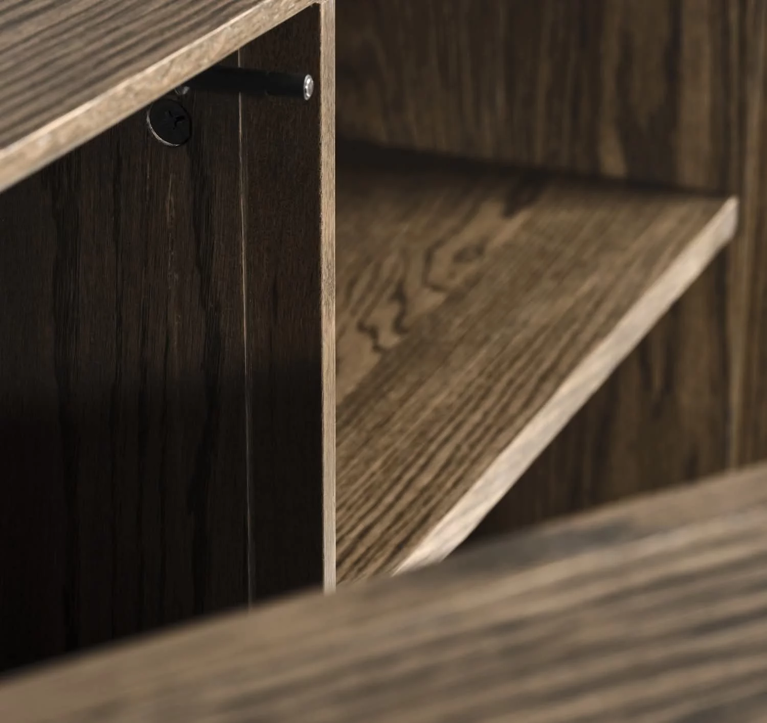 Dwie uchylne drzwi w kolorze dąb dymiony kryją w sobie cztery praktyczne półki, idealne do przechowywania książek, dekoracji czy dokumentów. Solidna konstrukcja gwarantuje stabilność, a minimalistyczny styl wpisuje się w aranżacje w duchu Modern.