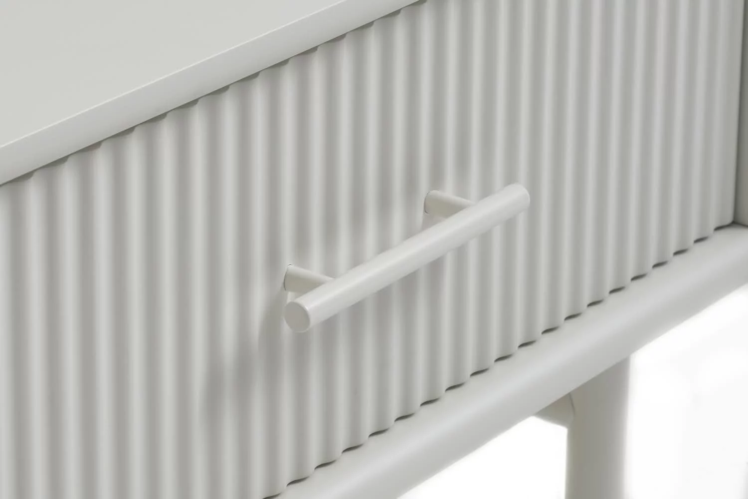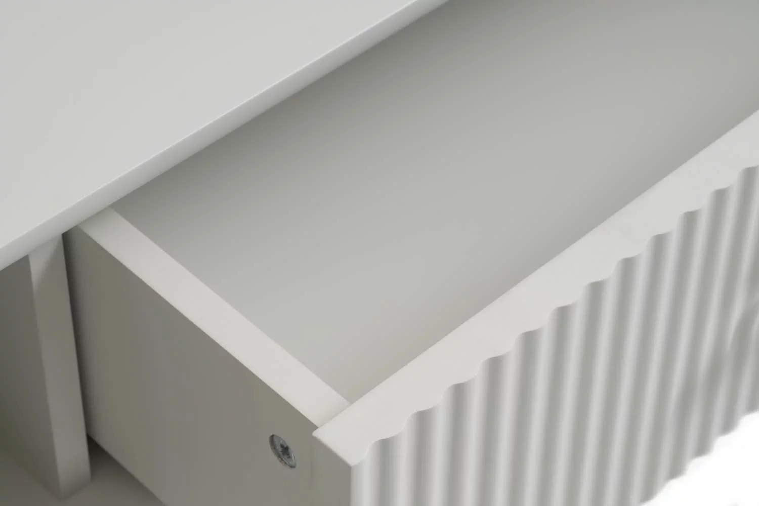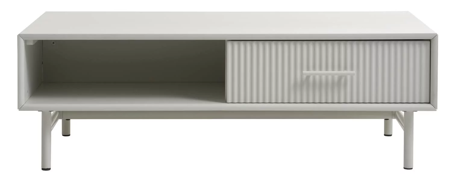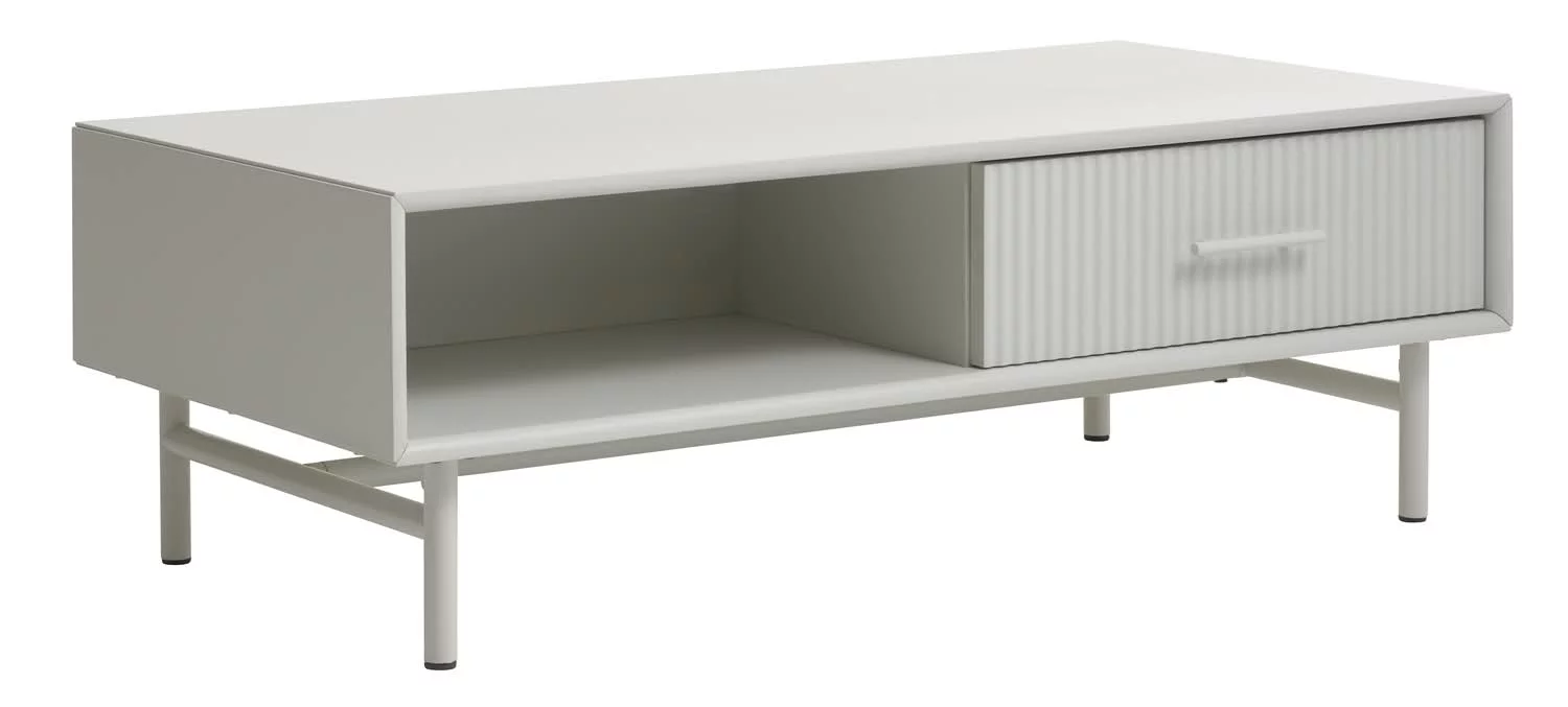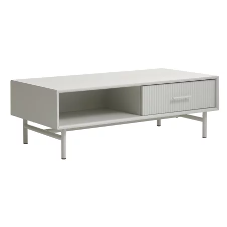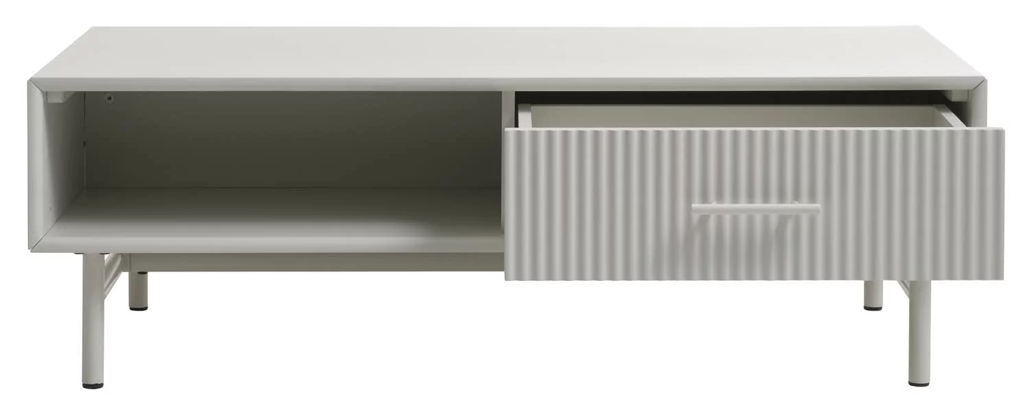 Blat oraz stelaż wykonane z MDF w jasnym szarym odcieniu nadają stolikowi lekkości i nowoczesnego charakteru, jednocześnie zapewniając trwałość i stabilność. Neutralna kolorystyka sprawia, że mebel łatwo dopasuje się do różnych aranżacji wnętrz, wprowadzając do pomieszczenia przytulną atmosferę.