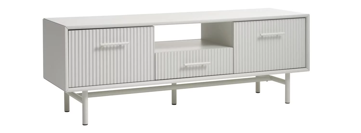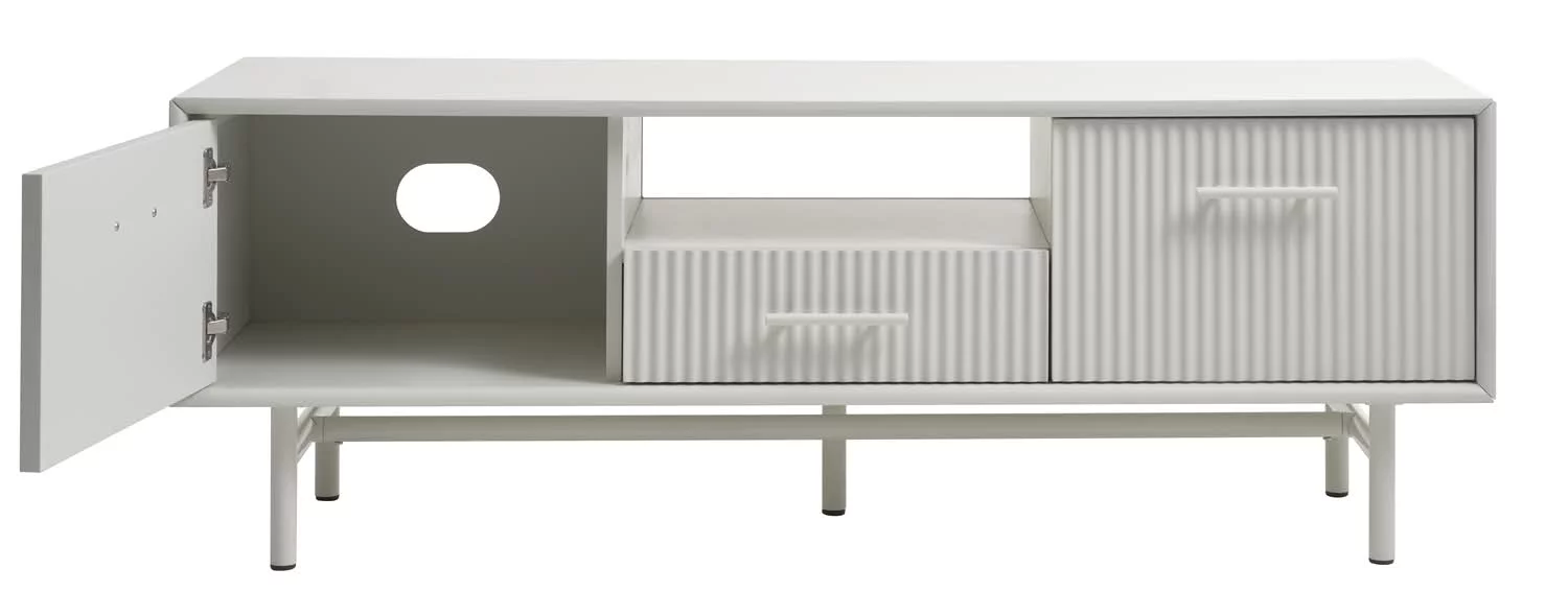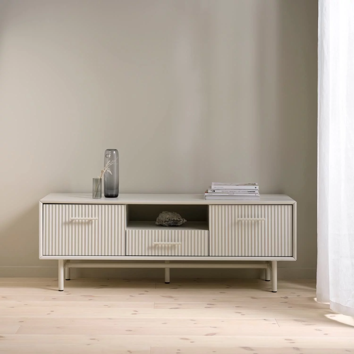 Szafka RTV PALMA 140 w kolorze ecru to elegancki i funkcjonalny mebel, który łączy minimalistyczny design z nowoczesnym stylem Modern. Doskonale sprawdzi się jako centralny punkt strefy multimedialnej w salonie, harmonijnie komponując się z innymi elementami wystroju.
