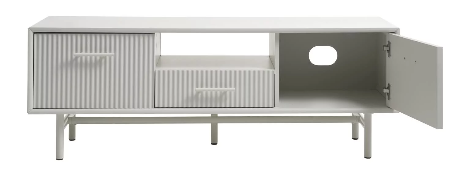Konstrukcja szafki wykonana jest z MDF i metalu, co zapewnia trwałość, stabilność oraz wytrzymałość przy codziennym użytkowaniu. Mebel wyposażono w dwie uchylne drzwi oraz szufladę, a także półkę, co pozwala na wygodne przechowywanie sprzętu RTV, akcesoriów oraz drobiazgów.