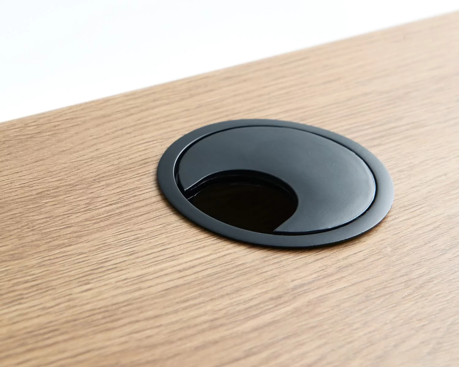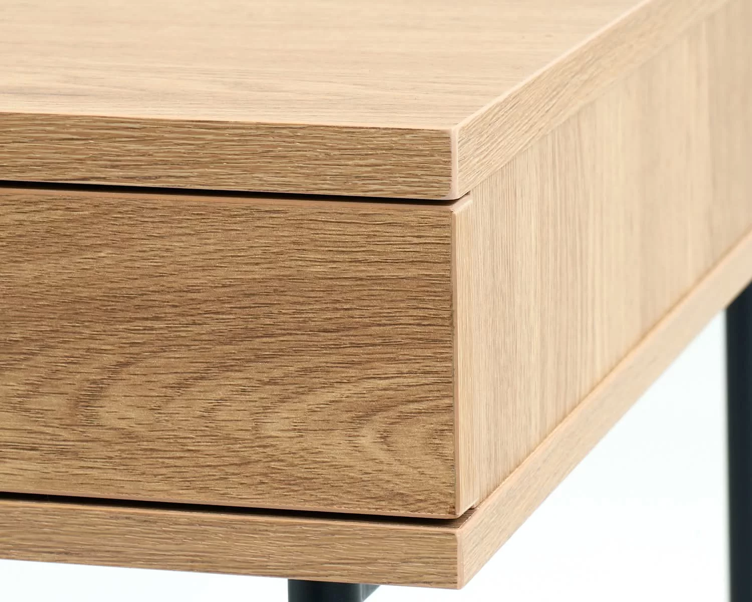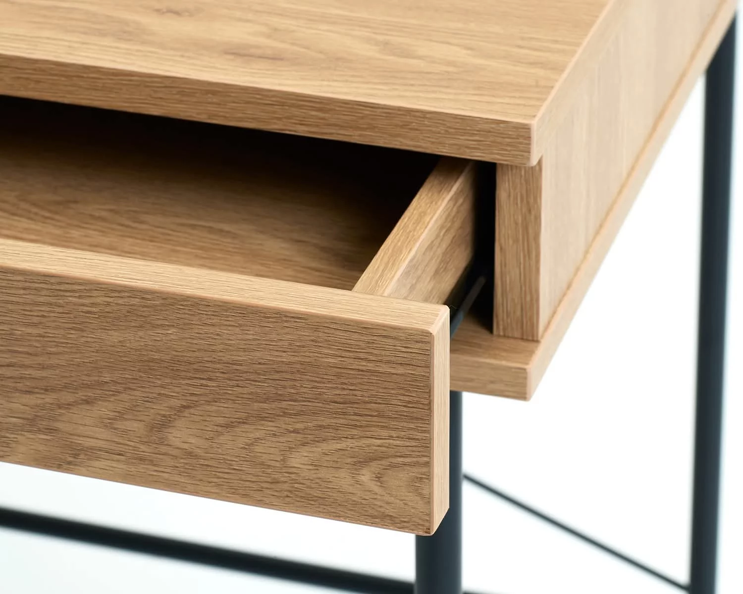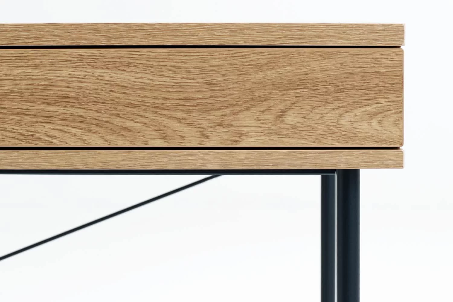 Wyposażone w jedną szufladę oraz otwory na kable, biurko zapewnia wygodne miejsce do pracy, nauki lub organizacji przestrzeni. Solidne metalowe nogi w czarnym kolorze gwarantują stabilność i trwałość mebla.