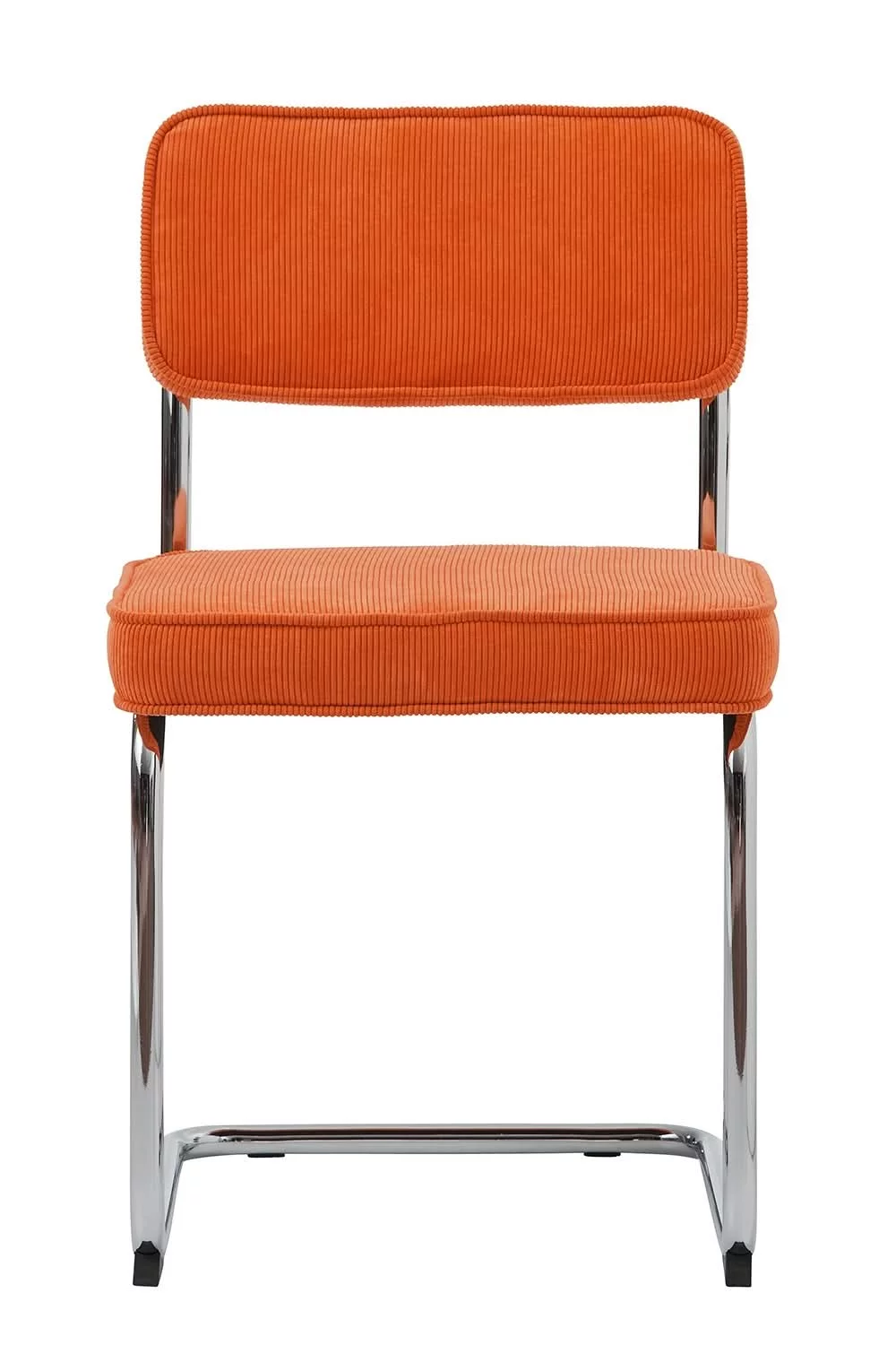 Siedzisko pokryte zostało miękką i przyjemną w dotyku tkaniną sztruksową, która nadaje meblowi wyjątkowego uroku i zapewnia wygodę podczas siedzenia. Krzesło osadzone jest na nowoczesnych metalowych płozach, które dodają mu lekkości oraz stabilności, a brak podłokietników sprawia, że z łatwością wsuniesz je pod stół, oszczędzając przestrzeń.