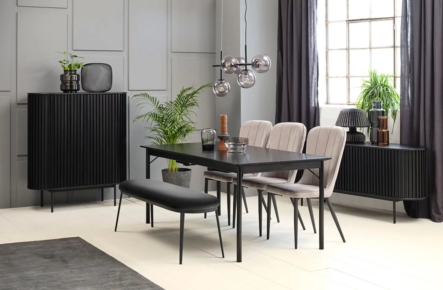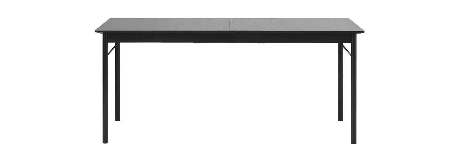 Blat wykonany z płyty fornirowanej w eleganckim, czarnym wykończeniu zachwyca swoją estetyką i trwałością. Stabilna konstrukcja oparta jest na metalowych nogach, również w czarnym kolorze, co tworzy spójną i harmonijną formę. Stół posiada funkcję rozkładania, a dzięki osobnym dokładkom z łatwością zwiększysz jego powierzchnię, aby wygodnie ugościć nawet 8 osób.