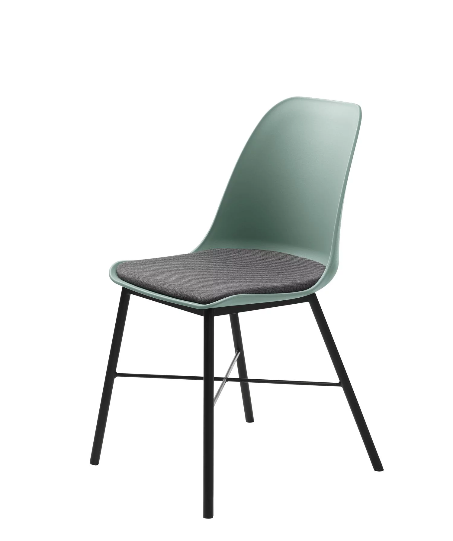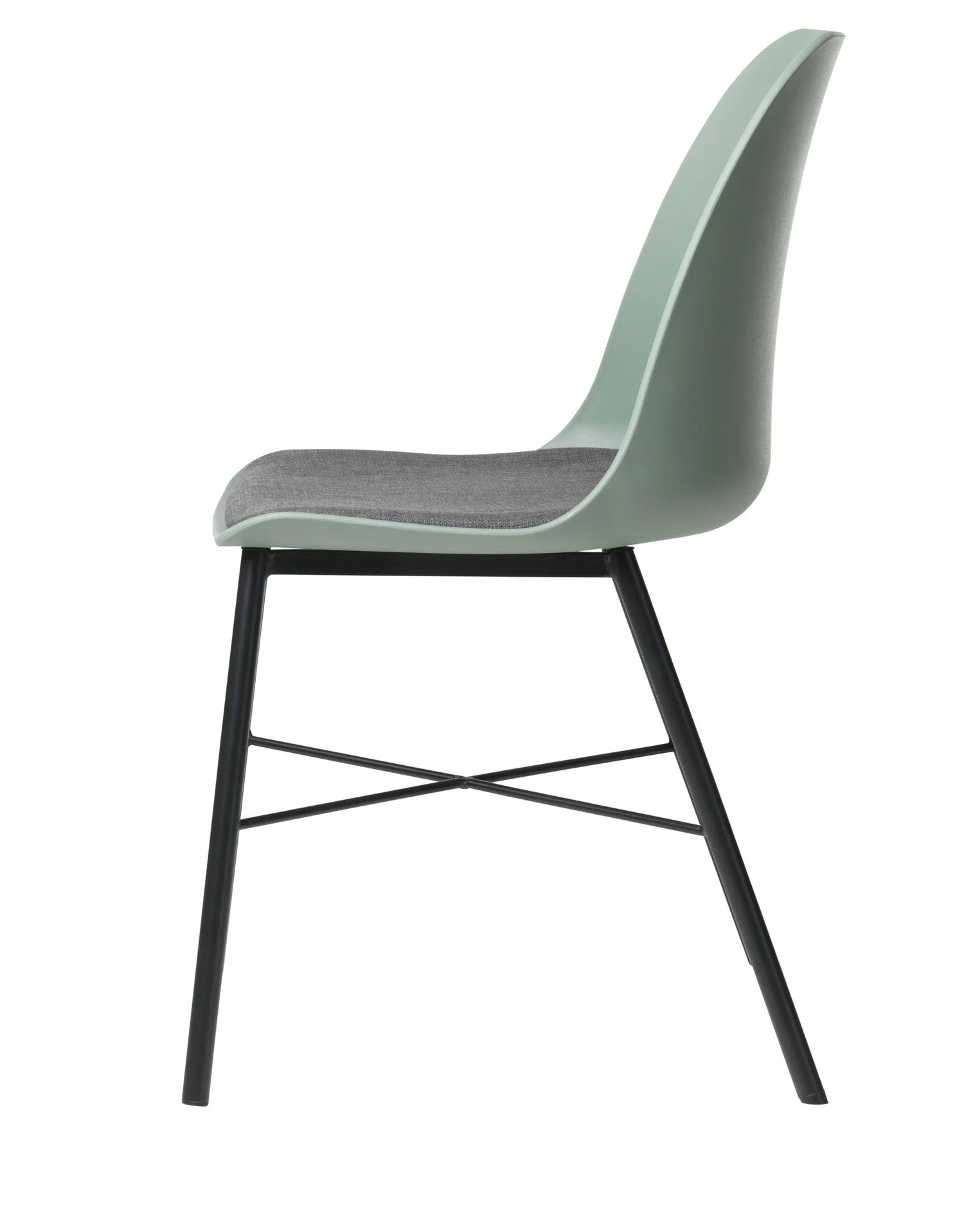 Krzesło zostało pokryte miękką tkaniną, która zapewnia wygodę użytkowania oraz przyjemny efekt wizualny. Stabilny stelaż z metalu w kolorze czarnym gwarantuje trwałość i wytrzymałość, a proste nogi podkreślają jego nowoczesny charakter.