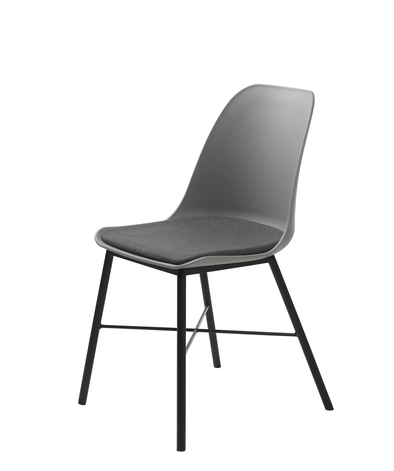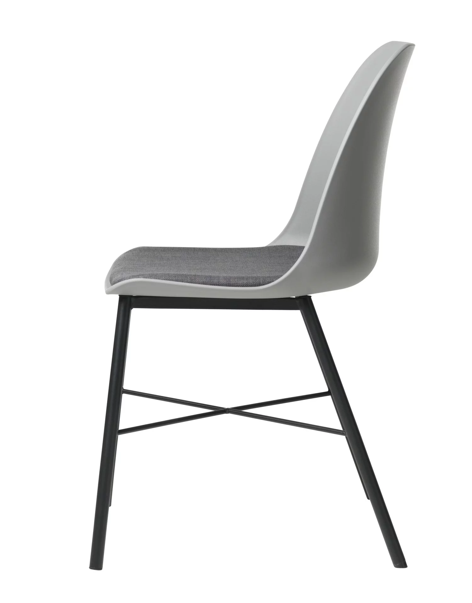Krzesło zostało pokryte miękką tkaniną, która zapewnia wygodę użytkowania oraz przyjemny efekt wizualny. Stabilny stelaż z metalu w kolorze czarnym gwarantuje trwałość i wytrzymałość, a proste nogi podkreślają jego nowoczesny charakter.