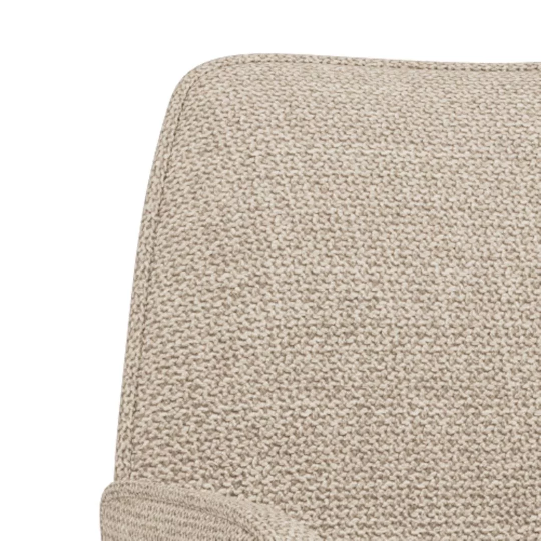 Model ten wyróżnia się obszernym, miękkim siedziskiem z wysokim oparciem, które zapewnia komfort porównywalny z tradycyjnym fotelem. Funkcja obrotowa o 360 stopni ułatwia komunikację z domownikami oraz wygodne zajmowanie miejsca przy blacie bez konieczności przesuwania całego mebla. Beżowa tkanina – często o strukturze szlachetnego weluru lub plecionki – ozdobiona jest charakterystycznymi dla serii VERMONT przeszyciami, które podkreślają jego elegancki profil. Całość spoczywa na solidnej, metalowej podstawie z praktycznym podnóżkiem, co gwarantuje stabilność nawet przy pełnym obrocie i podwyższonej pozycji siedzenia.