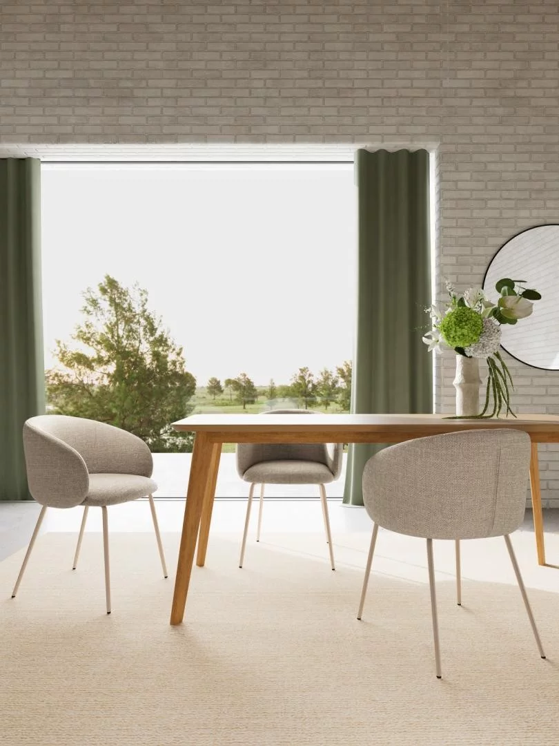 Model ZANE słynie z doskonale wyprofilowanego siedziska, które łączy w sobie cechy nowoczesnego designu z ergonomicznym komfortem. Charakterystyczne pionowe przeszycia na oparciu nadają mu subtelnej dynamiki i luksusowego sznytu. Wykorzystanie nóg w tym samym odcieniu co obicie sprawia, że krzesło wydaje się jeszcze lżejsze i delikatniejsze, stanowiąc idealne dopełnienie stołów w jasnym drewnie, bieli lub piaskowym kamieniu. Miękka, beżowa tkanina – często o strukturze weluru lub gęstej plecionki – jest przyjemna w dotyku i łatwo dopasowuje się do innych tekstur w pomieszczeniu, takich jak wełniane dywany czy lniane zasłony.