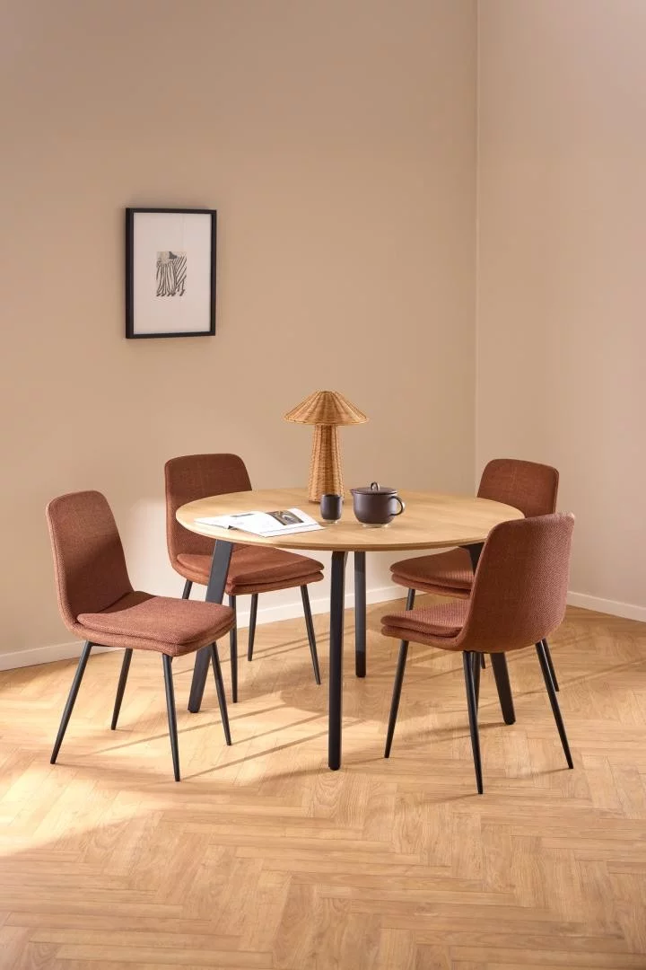 Kluczowym wyróżnikiem modelu BRERA jest harmonijne połączenie ergonomii z estetyką detalu. Brązowe oparcie zazwyczaj zdobione jest charakterystycznymi dla tej serii przeszyciami, które nadają bryle nowoczesny, geometryczny rytm. Siedzisko jest optymalnie wyprofilowane, co zapewnia komfort nawet podczas długiego biesiadowania, a zastosowana tkanina charakteryzuje się wysoką odpornością na ścieranie i łatwością w pielęgnacji. Całość osadzona na smukłych, najczęściej ciemnych nogach, prezentuje się lekko i elegancko, stanowiąc trwały i stylowy element wyposażenia jadalni lub gabinetu.
