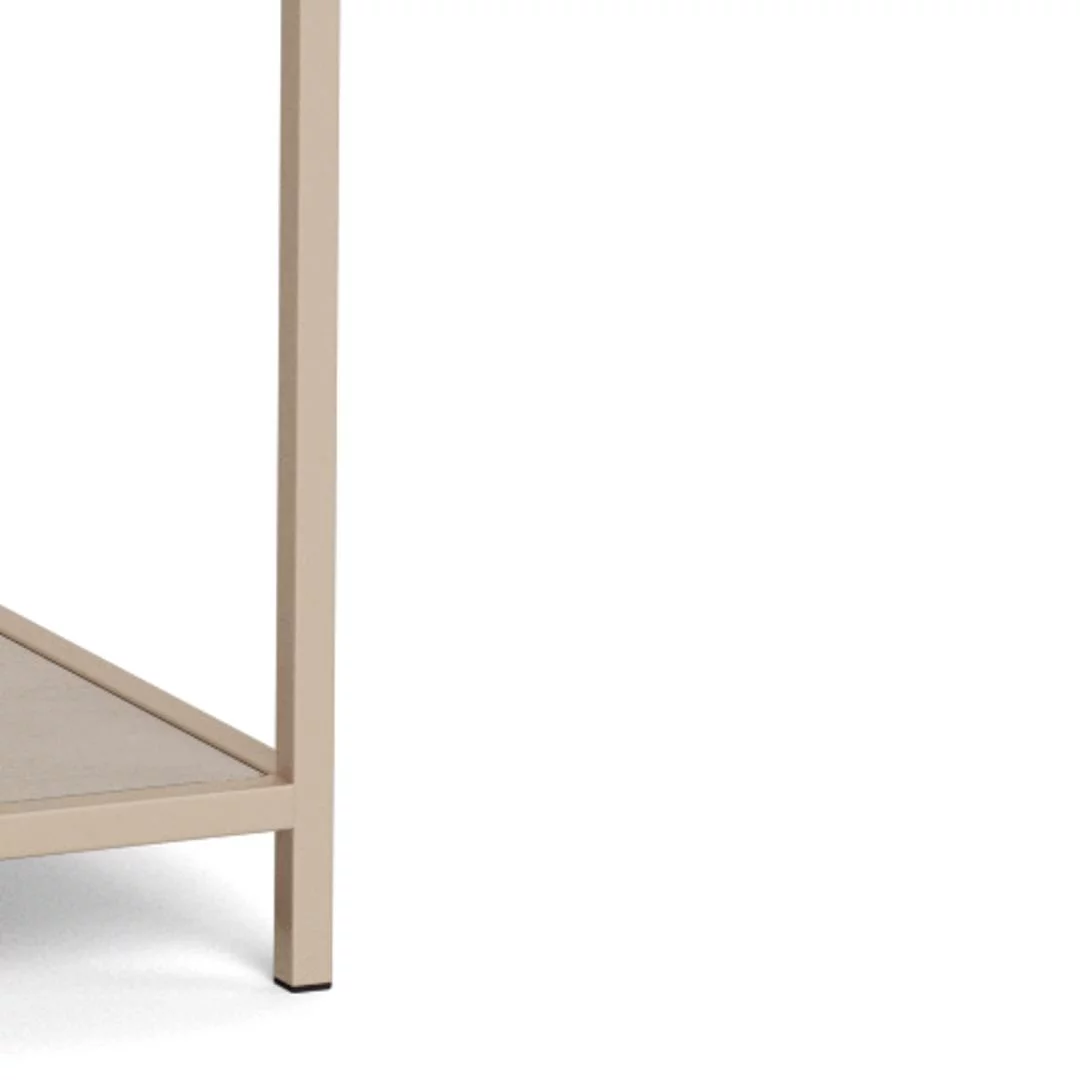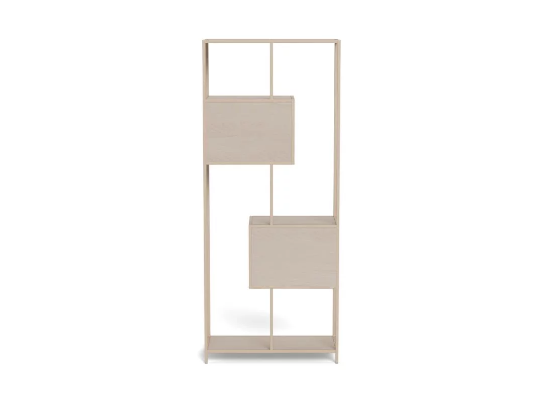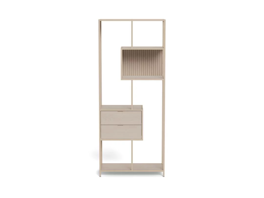 Mimo kompaktowych wymiarów (77x35 cm), model ten oferuje przemyślany system organizacji przestrzeni. Otwarte półki pozwalają na szybki dostęp do najczęściej używanych przedmiotów lub eksponowanie ulubionych ozdób, natomiast dolne szuflady stanowią doskonały schowek na rzeczy wymagające segregacji i ukrycia. Głębokość 35 cm gwarantuje, że regał nie będzie przeszkadzał w komunikacji, pozostając przy tym w pełni funkcjonalnym meblem. Beżowe wykończenie w połączeniu z prostą formą sprawia, że regał ZAKARIA staje się subtelnym, a zarazem niezwykle praktycznym dopełnieniem domowego wnętrza.
