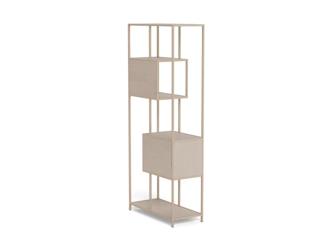 Regał ZAKARIA o szerokości 77 cm w beżowym wydaniu to idealne rozwiązanie do mniejszych pomieszczeń, w których liczy się każdy centymetr kwadratowy. Jego wąska i smukła sylwetka sprawia, że mebel ten doskonale odnajdzie się w przedpokoju, sypialni czy wąskim kąciku salonu. Beżowa kolorystyka wprowadza do wnętrza wizualną lekkość i świeżość, świetnie współgrając z aranżacjami w stylu skandynawskim, boho oraz nowoczesnym minimalizmem bazującym na kolorach ziemi.