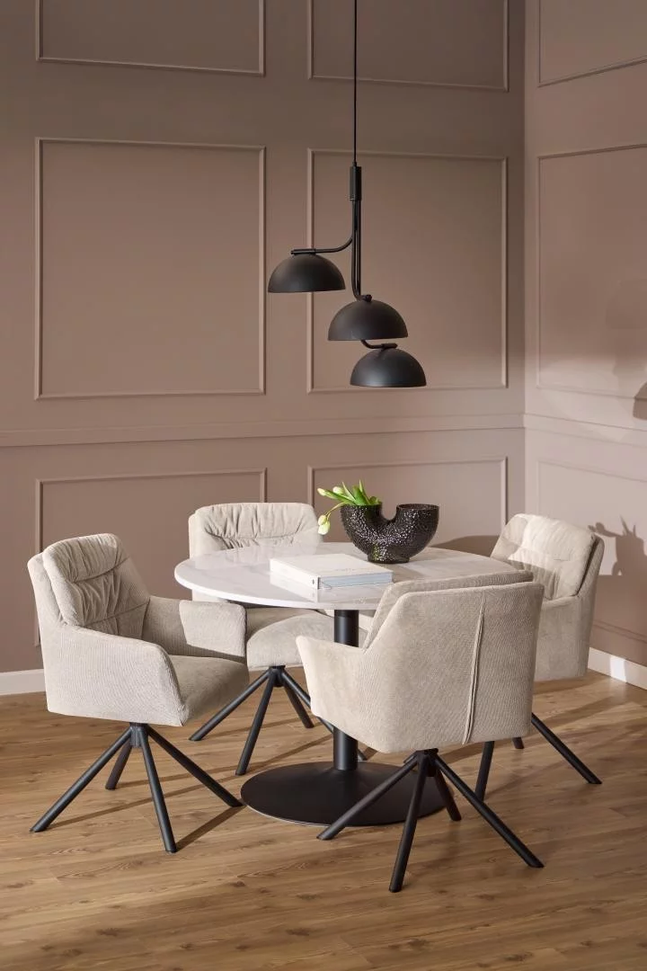 Kluczowym elementem modelu ASTON są zintegrowane podłokietniki o płynnej linii, które w połączeniu z głębokim siedziskiem oferują wyjątkowy komfort podczas długich spotkań przy stole. Krzesło zostało zaprojektowane tak, aby stanowić stabilne wsparcie dla sylwetki, a miękkie wypełnienie tapicerki potęguje wrażenie przytulności. Beżowy materiał o gęstym splocie charakteryzuje się dużą wytrzymałością, a staranne detale, takie jak precyzyjne wykończenie krawędzi, podkreślają wysoką klasę mebla. ASTON to krzesło, które nadaje jadalni prestiżowy wygląd, zachowując przy tym lekkość formy niezbędną w nowoczesnych mieszkaniach.
