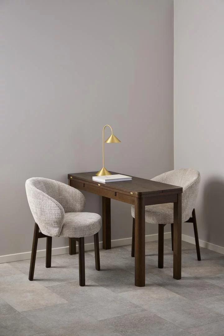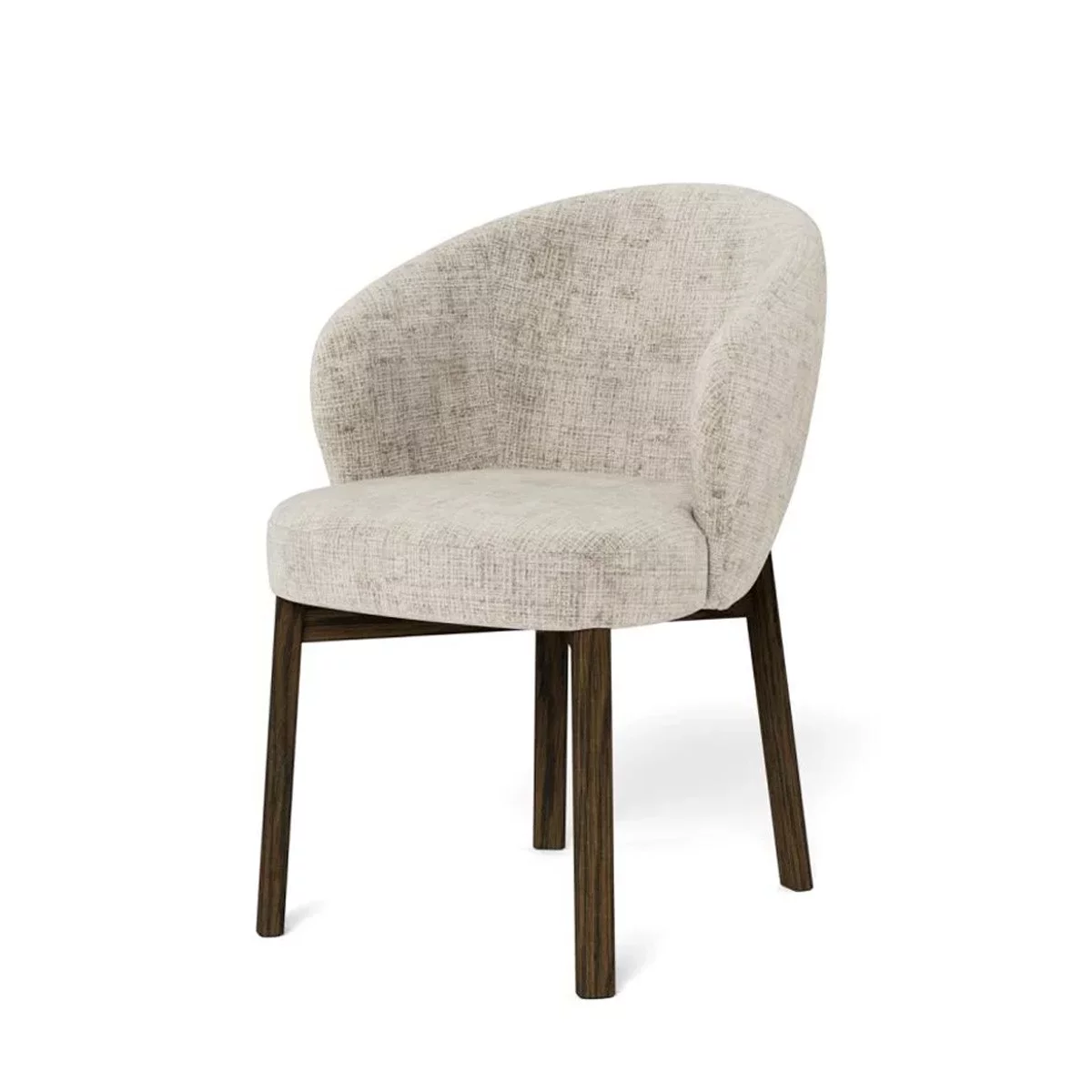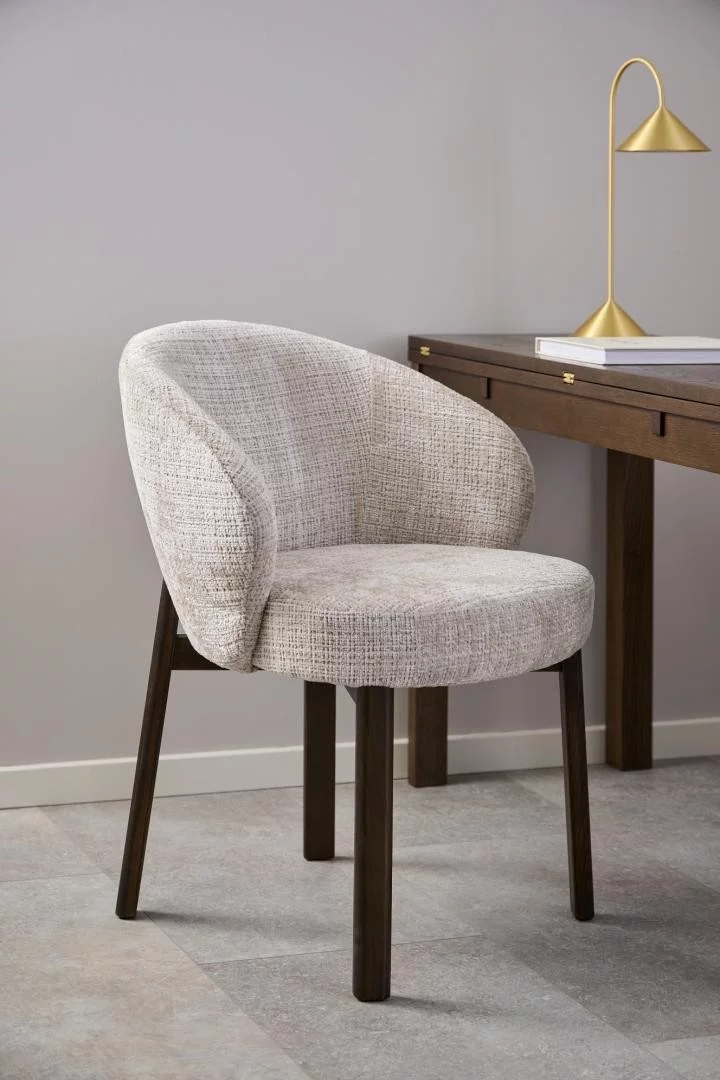 Model DINO z ciemną podstawą zachowuje swoje najlepsze cechy – charakterystyczne, kubełkowe oparcie o obłej linii, które gwarantuje wysoki komfort i podparcie. Beżowa tkanina wysokiej jakości rozjaśnia kompozycję, a kontrast z ciemnymi nogami (np. w kolorze orzecha lub wenge) podkreśla smukłość konstrukcji. Solidne wykonanie nóg z naturalnego drewna zapewnia trwałość i stabilność, a ich ciemne wykończenie dodaje krzesłu szlachetności, czyniąc je doskonałym dopełnieniem dużych stołów w jadalni lub eleganckich biurek w gabinecie.