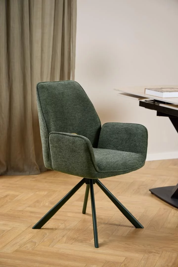 Konstrukcja modelu ZANTE została zaprojektowana tak, aby zapewniać maksymalne wsparcie dla sylwetki. Zintegrowane podłokietniki pozwalają na swobodne ułożenie rąk, co znacząco podnosi komfort podczas długich kolacji z bliskimi czy pracy przy biurku. Głęboki odcień zieleni doskonale komponuje się z ciemnymi lub drewnianymi nogami, nadając całości prestiżowego charakteru. Wytrzymała tkanina obiciowa cechuje się subtelnym splotem i jest niezwykle przyjemna w dotyku, sprawiając, że krzesło ZANTE jest nie tylko meblem użytkowym, ale prawdziwą ozdobą każdego nowoczesnego wnętrza.