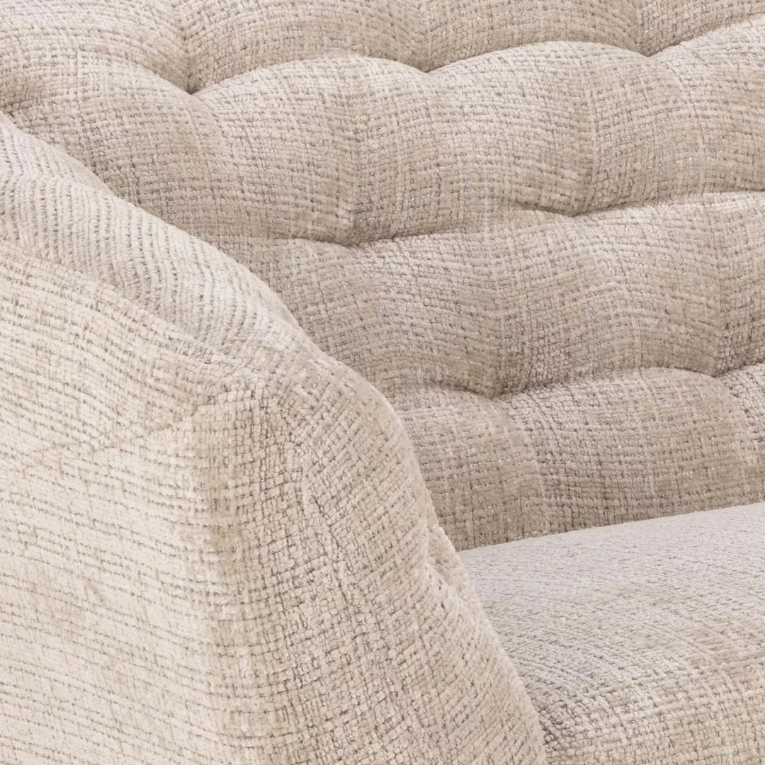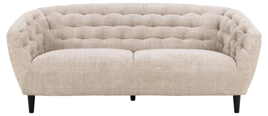 Wersja trzyosobowa oferuje szerokie, komfortowe siedzisko, które pozwala na swobodny odpoczynek kilku osób jednocześnie. Charakterystyczne pikowania oparcia stanowią nie tylko ozdobę, ale również zapewniają stabilne wsparcie, a miękkie boczki podnoszą komfort użytkowania. Wysokiej jakości tkanina w odcieniu ciepłego beżu jest niezwykle wdzięczna w aranżacji – doskonale współgra zarówno z pastelowymi dodatkami, jak i z wyrazistymi akcentami w kolorze złota, granatu czy butelkowej zieleni, tworząc przytulną i prestiżową przestrzeń wypoczynkową.