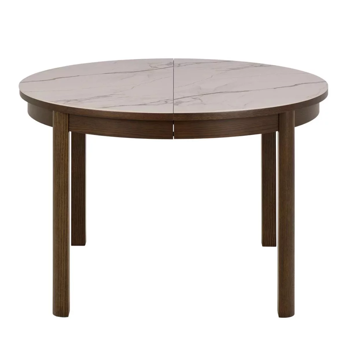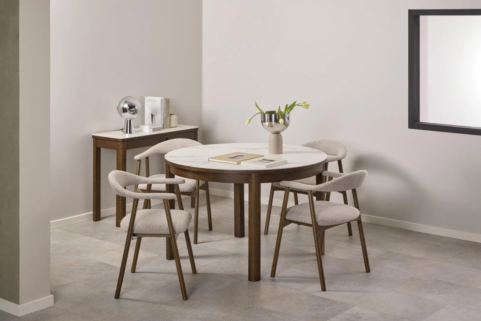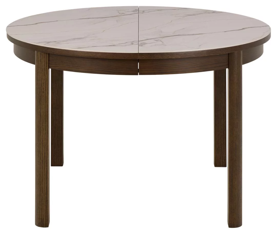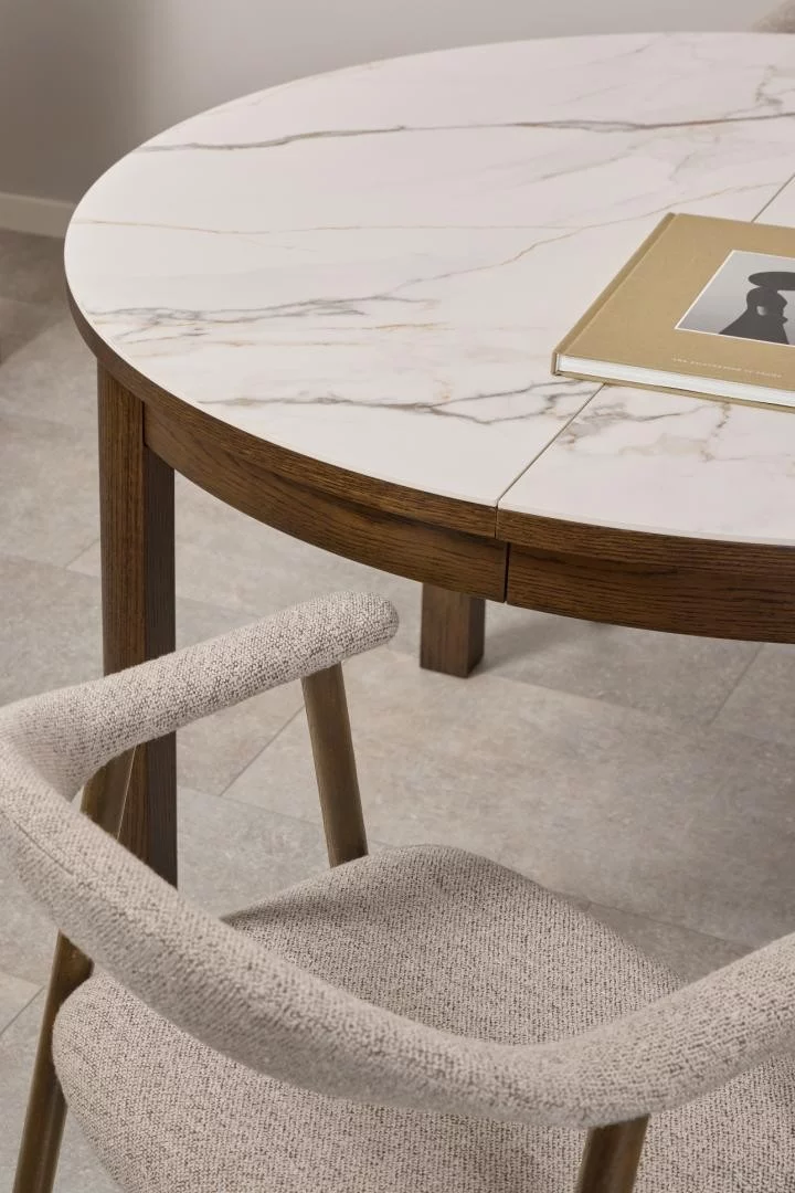 Stół okrągły MONS o średnicy 120 cm to mebel, który zachwyca nieoczywistym połączeniem materiałów. Szlachetny motyw marmuru spotyka się tutaj z ciepłem naturalnego drewna, tworząc kompozycję pełną klasy i nowoczesnego szyku. Okrągły kształt blatu sprzyja integracji, niwelując bariery między domownikami i nadając wnętrzu jadalni wyjątkowej miękkości oraz elegancji w stylu modern organic.