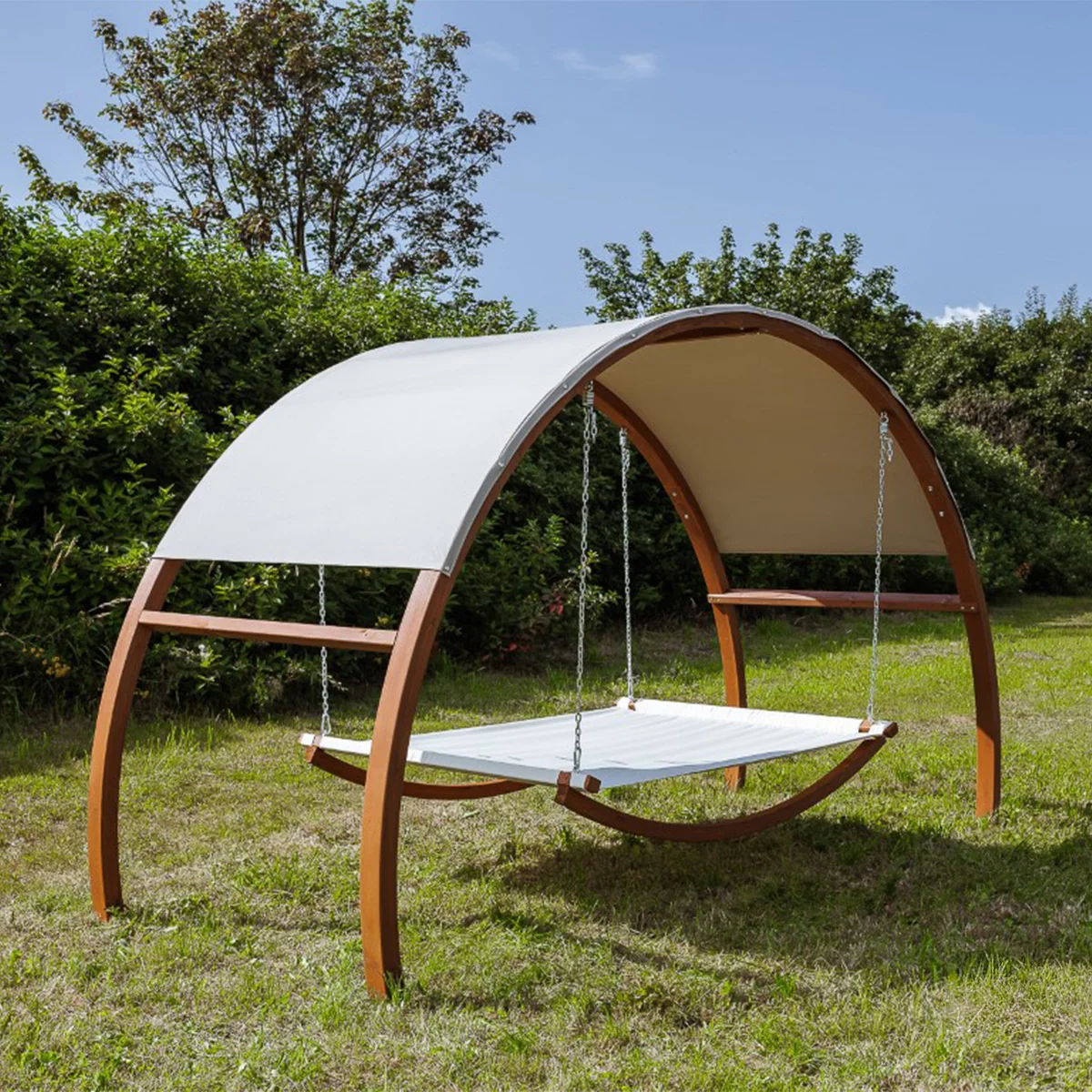 Projektując model Riposo, postawiliśmy na maksymalną wygodę i przestrzeń. Szeroka powierzchnia do leżenia pozwala na pełny relaks w dowolnej pozycji, a solidna konstrukcja o udźwigu do 250 kg zapewnia bezpieczeństwo nawet podczas wypoczynku we dwoje. Zintegrowany dach skutecznie chroni przed słońcem, pozwalając cieszyć się przyjemnym chłodem nawet w najbardziej upalne dni. To coś więcej niż mebel – to Twoja osobista oaza spokoju, stworzona z pasją i dbałością o każdy szczegół.