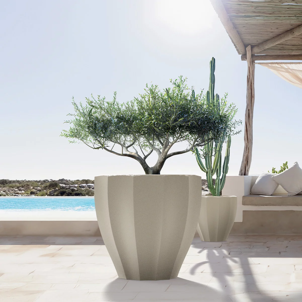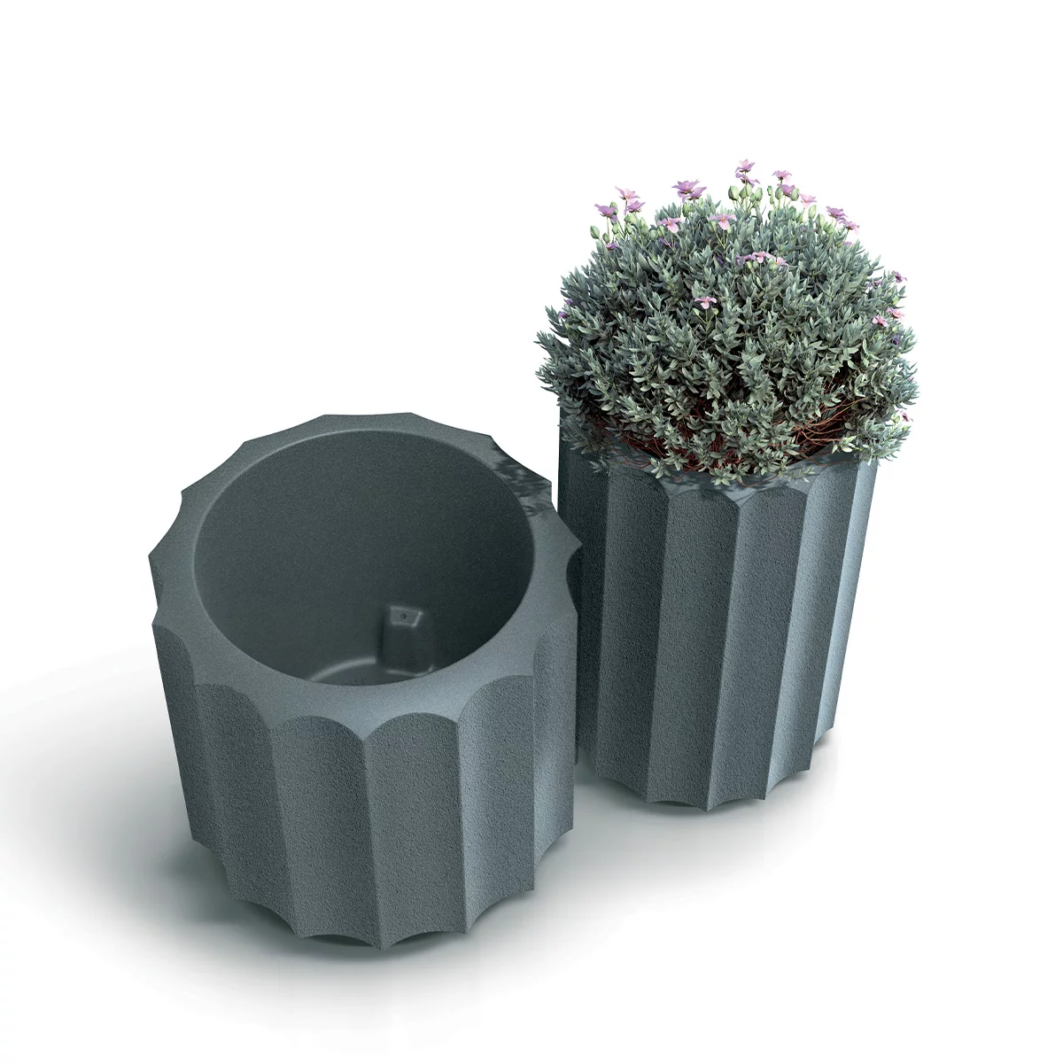 Donica TR80 Rona to model o imponującej skali, zaprojektowany z myślą o najbardziej reprezentacyjnych przestrzeniach. Jej klasyczny, okrągły kształt o średnicy 80 cm sprawia, że jest to doskonały fundament dla dużych projektów zieleni – od wieloletnich drzewek ozdobnych, przez rozłożyste krzewy, aż po egzotyczne palmy. Seria Rona charakteryzuje się ponadczasowym minimalizmem, który nie dominuje nad roślinnością, lecz stanowi dla niej szlachetną i stabilną oprawę. Dzięki swoim gabarytom, model TR80 idealnie sprawdza się w przestrzeniach publicznych, na dużych tarasach oraz w przestronnych wnętrzach komercyjnych, takich jak centra handlowe czy lobby biurowców.