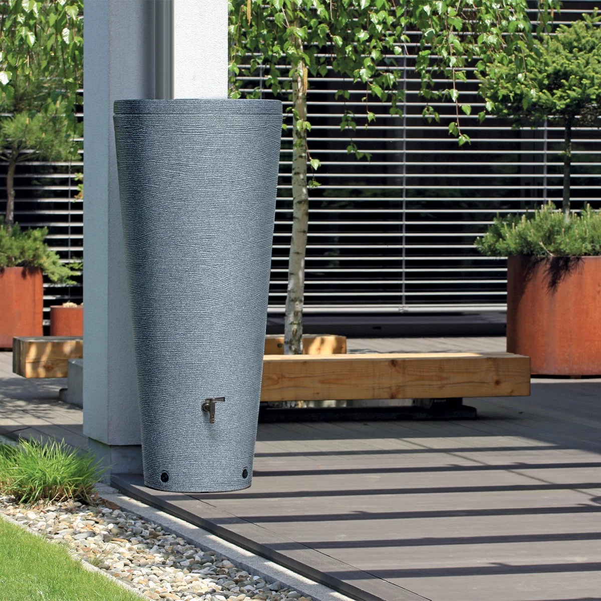 Zbiornik na deszczówkę RWT210 Tubo to nowoczesne rozwiązanie retencyjne, które wyróżnia się czystą, cylindryczną formą i oszczędną stylistyką. Dzięki pojemności 210 litrów, model ten został zaprojektowany z myślą o mniejszych ogrodach, tarasach oraz strefach przyściennych, gdzie kluczowe jest optymalne zagospodarowanie ograniczonej przestrzeni. Jego smukła, kolumnowa sylwetka o gładkiej powierzchni sprawia, że zbiornik idealnie wtapia się w otoczenie nowoczesnych elewacji, minimalistycznych aranżacji roślinnych oraz stref wypoczynkowych. Jest to doskonały wybór dla osób poszukujących dyskretnego i estetycznego magazynu wody, który dzięki swojej uniwersalnej geometrii stanowi subtelne dopełnienie małej architektury ogrodowej, nie dominując nad otoczeniem.