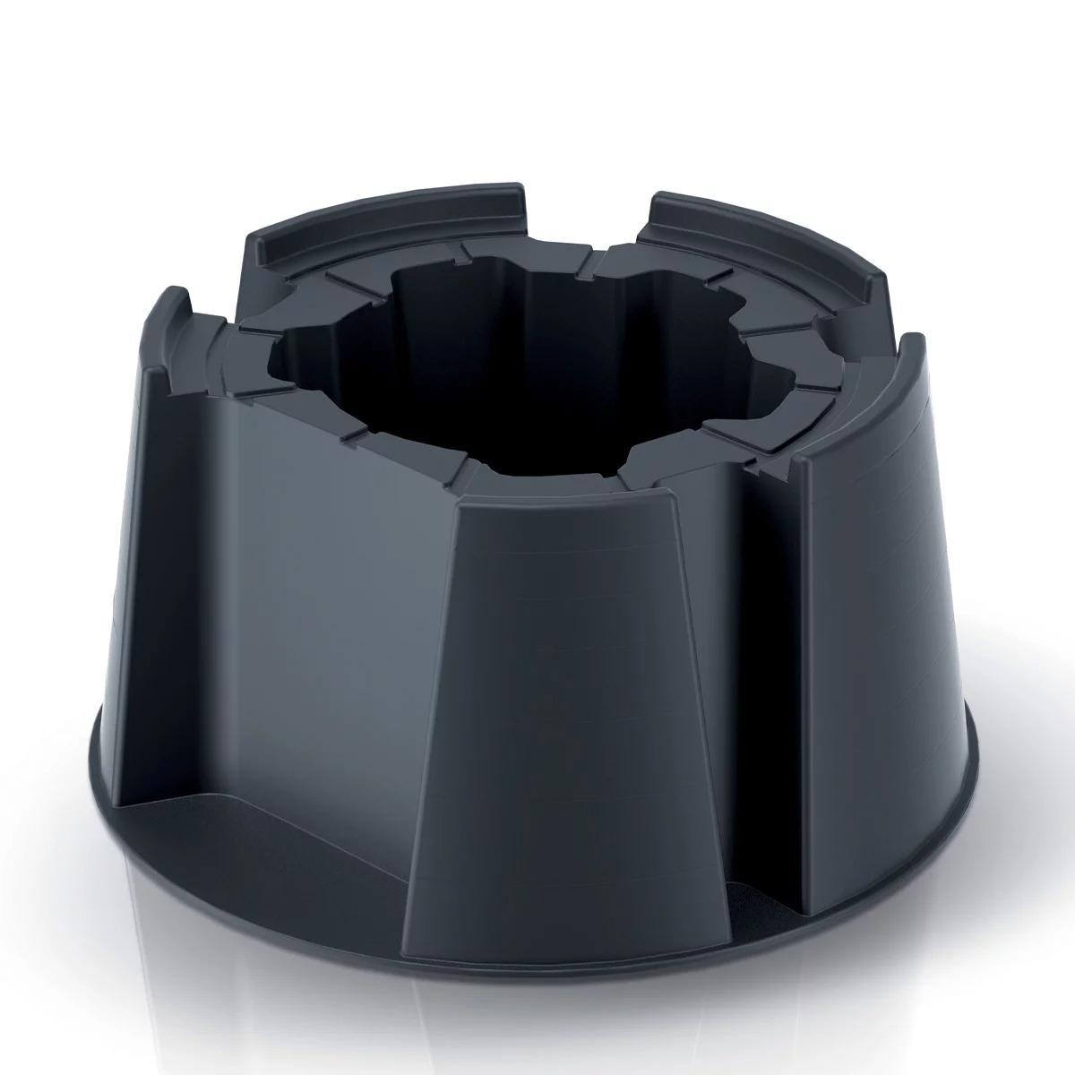 Pod kątem technologicznym podstawa IBAS2 Basecan reprezentuje najwyższy standard osprzętu technicznego. Wykonanie z wysokogatunkowego polietylenu zapewnia elementowi wyjątkową sztywność strukturalną i ogromną wytrzymałość na nacisk statyczny. Konstrukcja została wzmocniona zaawansowanym systemem wewnętrznych żeber, który równomiernie rozkłada ciężar napełnionego zbiornika na podłoże, zapobiegając jego osiadaniu czy deformacji podstawy pod wpływem znacznego ciężaru wody. Materiał ten jest w pełni uodporniony na promieniowanie UV, wilgoć oraz skrajne wahania temperatur, co ma kluczowe znaczenie dla elementu mającego bezpośredni kontakt z gruntem i narażonego na długotrwałe działanie niekorzystnych czynników zewnętrznych.