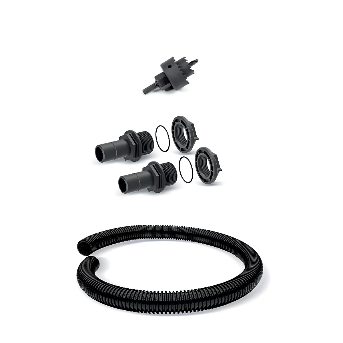 Pod kątem technologicznym zestaw ICANS8 Icanset reprezentuje najwyższy standard osprzętu do mikroretencji. Składa się on z precyzyjnie wykonanych komponentów z wysokogatunkowych tworzyw sztucznych (ABS oraz elastycznych polimerów), które są w pełni uodpornione na działanie promieniowania UV, skrajnych temperatur oraz zanieczyszczeń organicznych niesionych przez wodę opadową. Kluczowym elementem zestawu jest otwornica o odpowiednio dobranym profilu zęba, która pozwala na wykonanie idealnie centrycznych otworów w rurze spustowej oraz w ściankach zbiornika, co jest warunkiem koniecznym dla zachowania 100% szczelności układu. W skład zestawu wchodzi również elastyczny wąż przyłączeniowy o zoptymalizowanym karbowaniu, który niweluje drgania i pozwala na swobodne ustawienie zbiornika względem rynny, a także uszczelki wargowe zapewniające trwałe połączenie mechaniczne bez konieczności stosowania klejów czy silikonów.